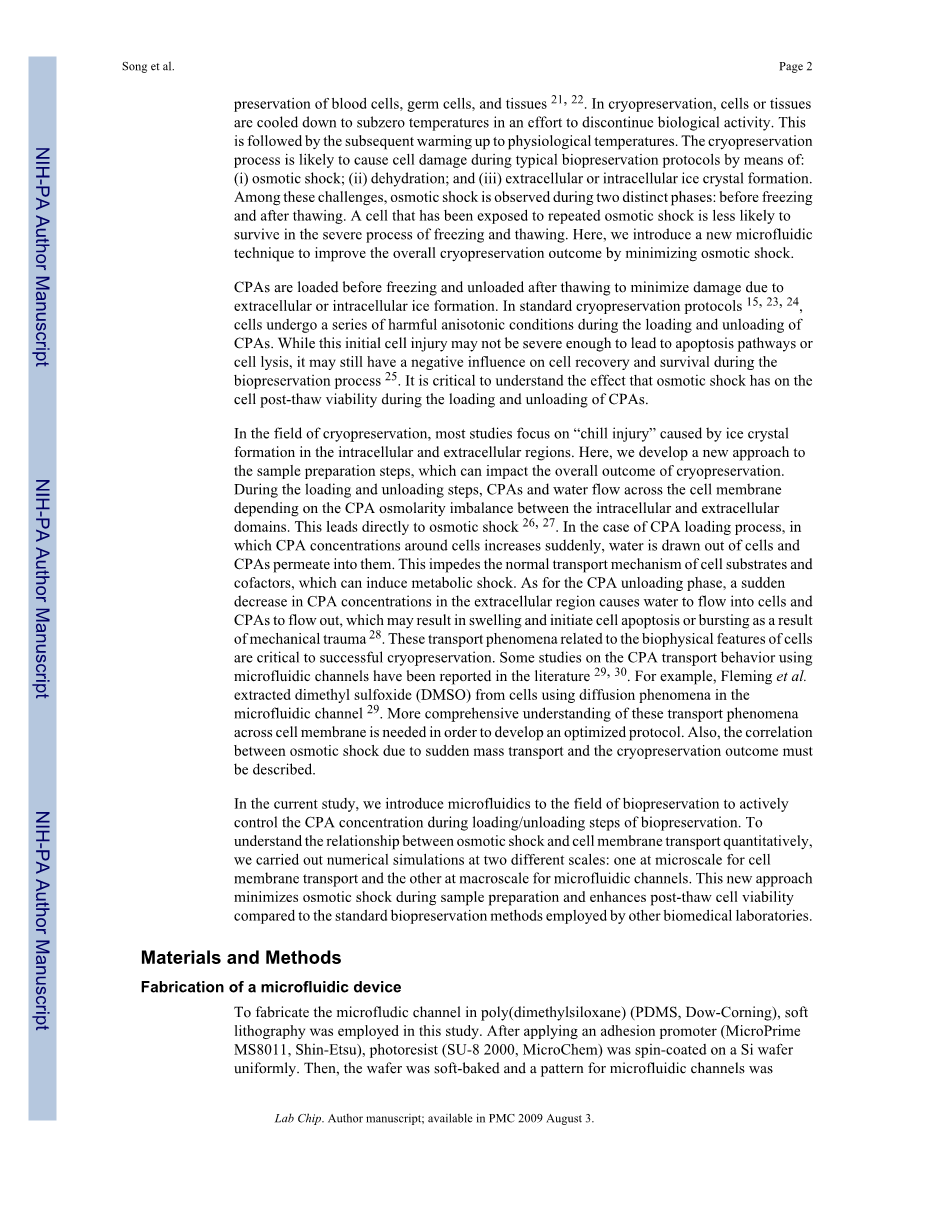 在当前的研究中,我们将微流控技术引入到生物储存领域,以在生物储存的加载和卸载步骤期间主动控制CPA的浓度。为了定量地了解渗透压休克和细胞膜运输之间的关系,我们在两个不同的尺度上进行了数值模拟:一个是用于细胞膜运输的微观尺度,另一个是用于微通道的宏观尺度。与其他生物医学实验室采用的标准生物储存方法相比,这种新方法将样品制备过程中的渗透压休克降至最低,并增强了解冻后的细胞活性。