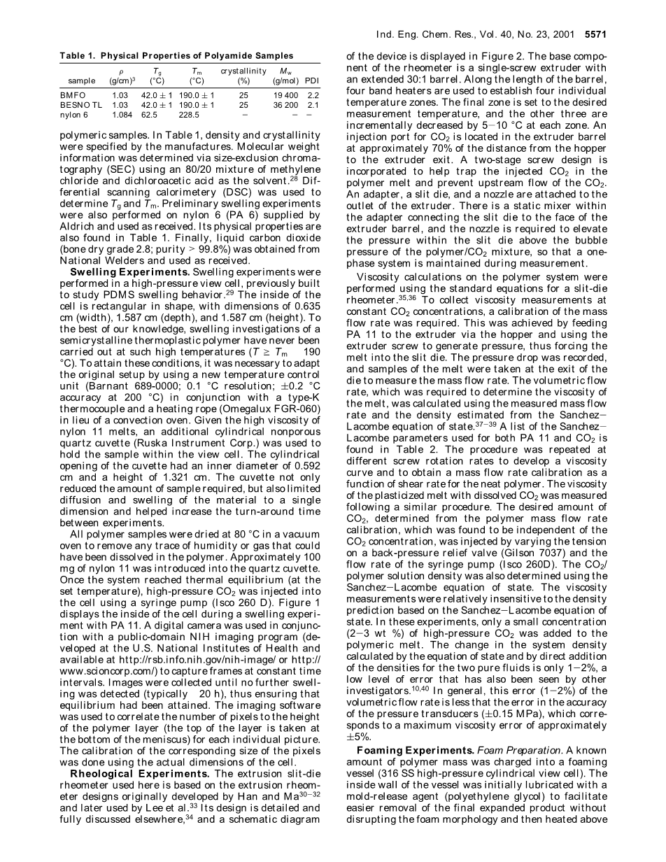 在表1中,制造商规定了密度和结晶度。 使用二氯甲烷和二氯乙酸的80/20混合物作为溶剂,通过体积排除色谱法(SEC)测定分子量信息【28】。使用差示扫描量热法(DSC)测定Tg和Tm。 对Aldrich提供的尼龙6(PA6)也进行了初步的膨胀实验,并按原样使用。 其物理性质也在表1中找到。最后,液态二氧化碳(骨干等级2.8;纯度gt; 99.8%)从National Welders获得并按原样使用。
