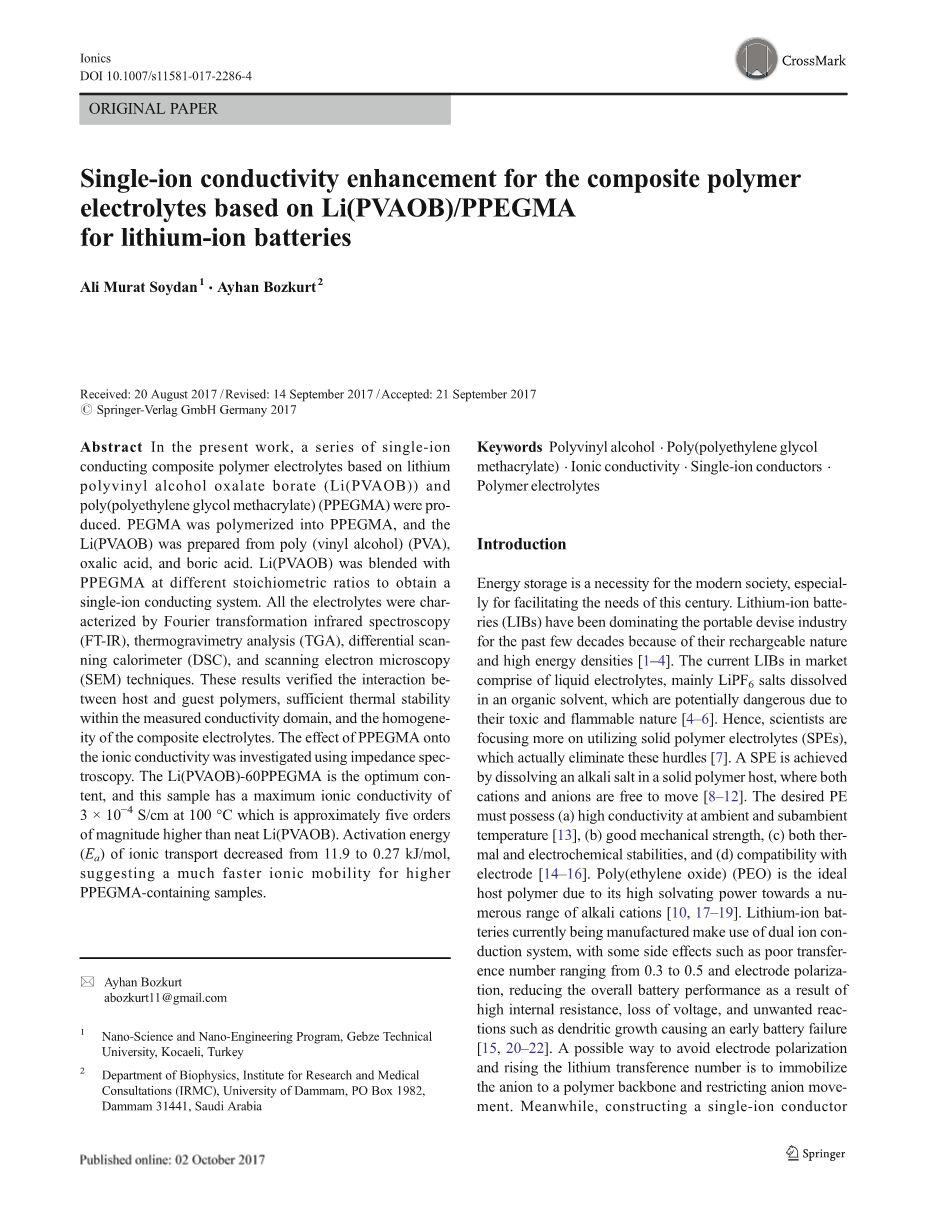 关键词 聚乙烯醇 聚(甲基丙烯酸聚乙二醇酯) 离子电导率 单离子导体 聚合物电解质