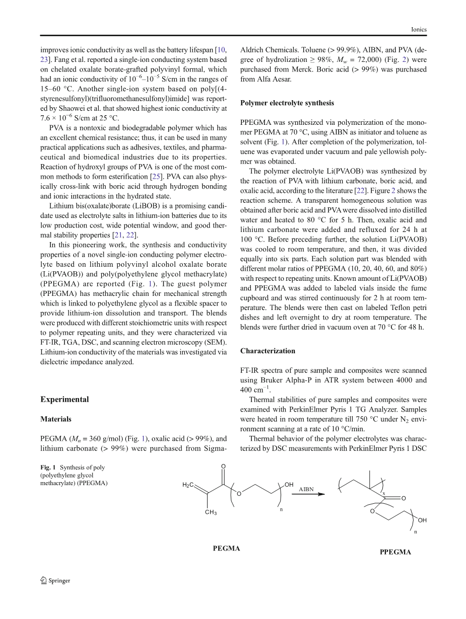 本文报道了一种新型的单离子导电聚合物电解质-聚乙烯醇草酸盐硼酸锂(Li(PVAOB))和聚(甲基丙烯酸聚乙二醇酯)(PPEGMA)复合物的合成及其导电性能(图1)。 客体聚合物(PPEGMA)含有链接到聚乙二醇上的具有一定机械强度的甲基丙烯酸链段。作为一种柔性间隔基,它可以为锂离子提供溶解和传输的场所。共混物是以聚合物重复单元作为计量标准,用不同化学计量比的PPEGMA与主体聚合物Li(PVAOB)共混制得,并通过FT-IR、TGA、DSC和扫描电镜(SEM)技术对共混物性能进行了表征,而材料对锂离子的电导率是通过介电阻抗分析技术进行研究的〪