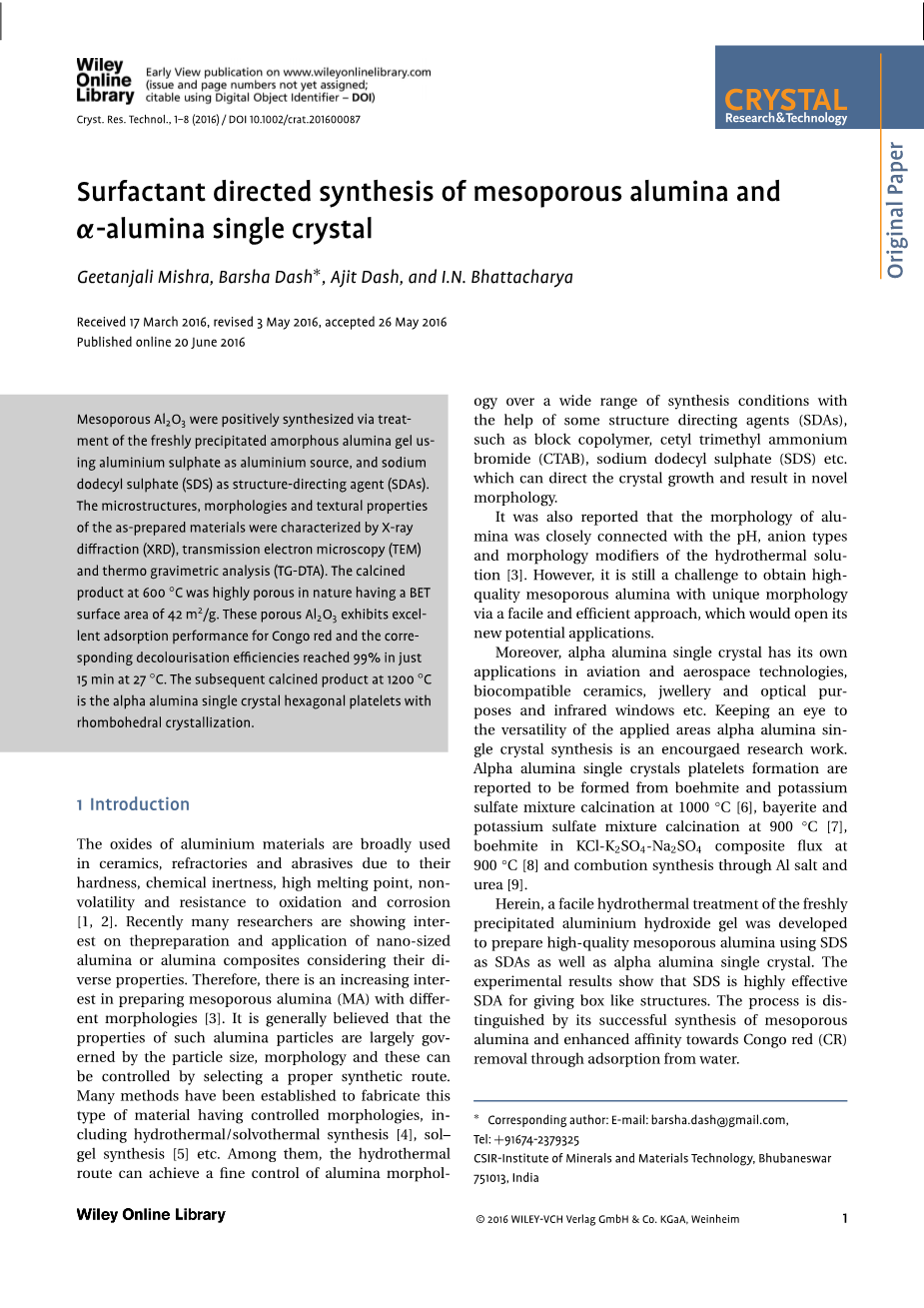 Geetanjali Mishra, Barsha Dashlowast;, Ajit Dash, and I.N. Bhattacharya