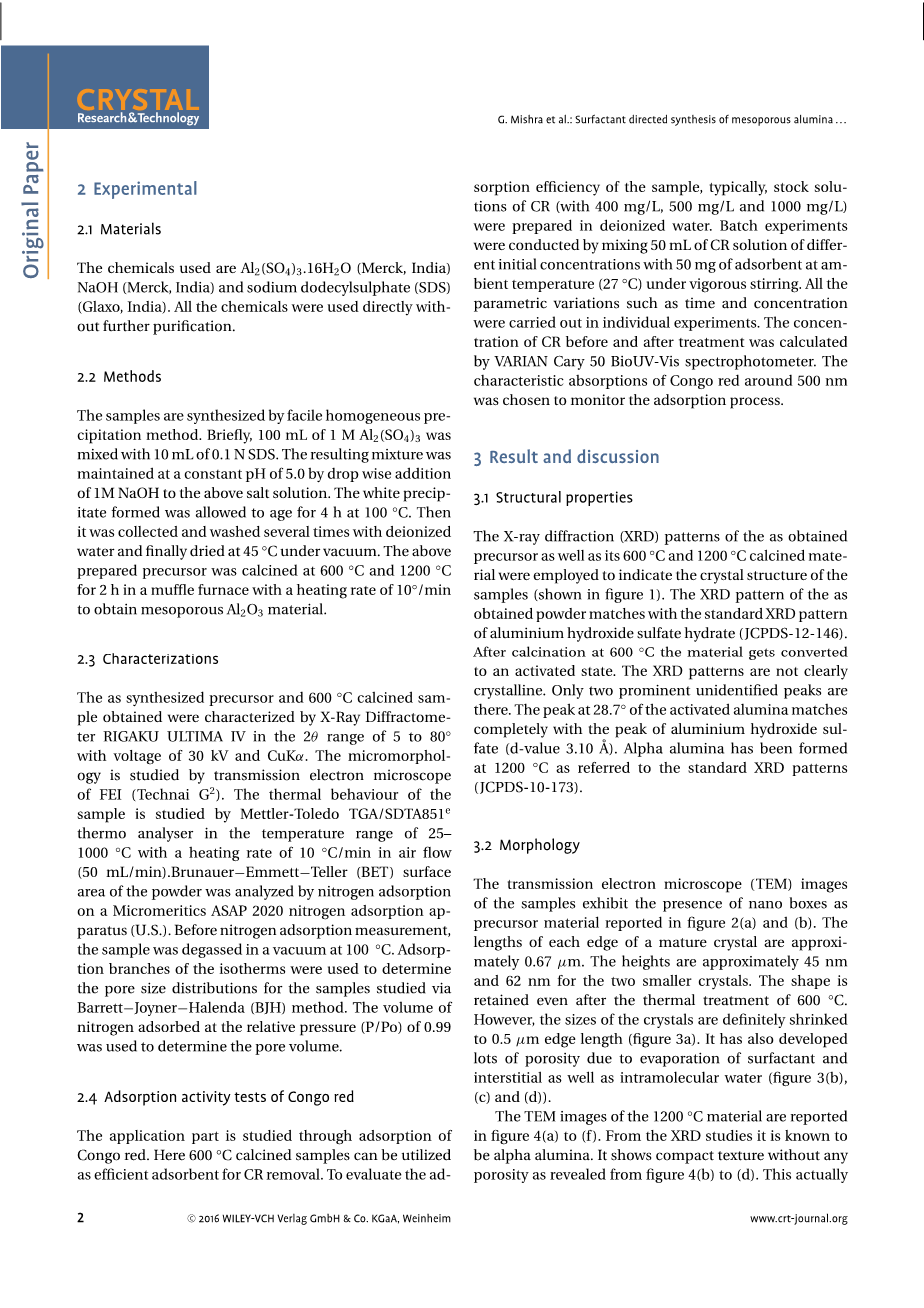 样品通过简单的的均匀预沉淀法合成。简而言之,100毫升的1 M Al2(SO4)3混合10毫升的0.1 N SDS。所得混合物溶液pH值维持在5,通过加入1M NaOH,保持恒定ph值。白色沉淀在100 °C下老化4小时。然后用去离子水收集和洗涤几次,最后在真空下以45℃干燥。制得的前驱体在600℃和1200℃煅烧。马弗炉中加热速率为10°/min,最后得到介孔Al2O3材料。