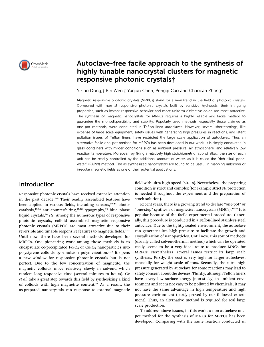 磁响应光子晶体代表了在光子晶体中的一个新的趋势。相比由敏感性水凝胶制成的普通响应光子晶体而言,磁响应光子晶体最吸引人的地方在于还有许多有趣的属性,像即时的响应行为,均匀的衍射颜色等。磁响应光子晶体中磁性纳米晶体和合成要求高度可靠且简便的方法,特别是宣称为一步法的,是在聚四氟乙烯反应釜中完成反应。但这种方法有一些缺点,像消耗大型设备,因反应产生的高压而带来的安全问题和聚四氟乙烯反应釜潜在的污染问题。这些问题都限制了反应的大规模使用。因此,我们在工作中找到了一种可代替且易行的一步法合成磁响应光子晶体。这种方法能够在玻璃容器中以更温和的条件反应,像常压空气中和相对低的反应温度下。此外,有一种“富碱贫水”的合成方法,通过混合高化学计量的碱,由加入水的量来控制单元晶体的大小。这个纳米晶体的合成方法为绘制未知或不规则磁领域提供了一种新的潜在应用。