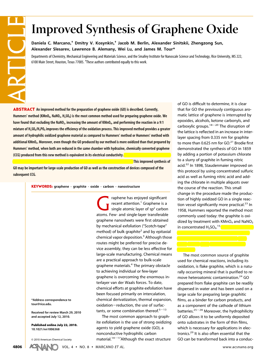 摘要 本文介绍了一种制备氧化石墨烯(GO)的改进方法。目前,Hummers方法(高锰酸钾、硝酸钠、硫酸)是用于制备氧化石墨烯的最常用的方法。我们发现不含硝酸钠,增加高锰酸钾的量,并将硫酸与磷酸以9:1的比例进行混合反应从而提高了氧化过程的效率。这一改进方法与Hummers法或添加高锰酸钾的Hummers法相比,提供了更多量的亲水氧化石墨烯材料。此外,该方法制备得到的GO比Hummers法所制备的氧化程度更高,但是当两者在同一条件下用肼还原时,新方法与化学法转化的石墨烯(CCG)在其电导率上等值。与Hummers法相比,新方法不产生有毒气体,温度也易于控制。GO的这种改进的合成对于GO的大规模生产以及由随后的CCG组成的装置的构建可能是重要的。