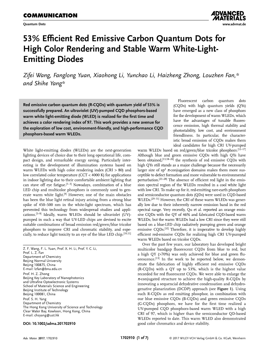 高量子产率(QYs)的荧光碳量子点(CQDs)已经成为促进暖白光二极管发展的一类新的荧光粉,这类荧光粉具有发射荧光温和,温度稳定性高和耐光性好,低成本,环境友好的优点,尤其是,荧光碳量子点发射广泛这一特点使得其成为了制作高显色系数的基于红绿蓝三色荧光紫外激发暖白光二极管的理想材料。虽然已经获得了高量子产率的蓝色和绿色的荧光碳量子点,但是高量子产率的红光发射荧光碳量子点的合成仍然是一个主要挑战,这是因为一定大的sp2-共轭域使得其更易受到缺陷形成的影响以及对于环境混乱更加敏感。白光二极管的发射光谱中有效率的红光缺失导致产生了低显色指数的冷白光。为了弥补这一缺陷,红光发射稀土荧光粉和半导体量子点被应用于基于荧光碳量子点的白光二极管。然而,由于暖白光发光二极管在红色光谱中发射谱带窄这一固有特点使得暖白光发光二极管的显色指数低。最近, Qu et al.报告了一量子产率为46%的橙色发光荧光碳量子点和组合式基于荧光量子点的暖白光二极管,但是由于暖白光二极管仍基于蓝色LED芯片辐射式注入绿色和橙色发射荧光碳量子点,其显色系数很低。因此,发展高效率红光发射荧光碳量子点对于实现高显色系数的基于三色CQDs的紫外荧光暖白光发光二极管至关重要。
