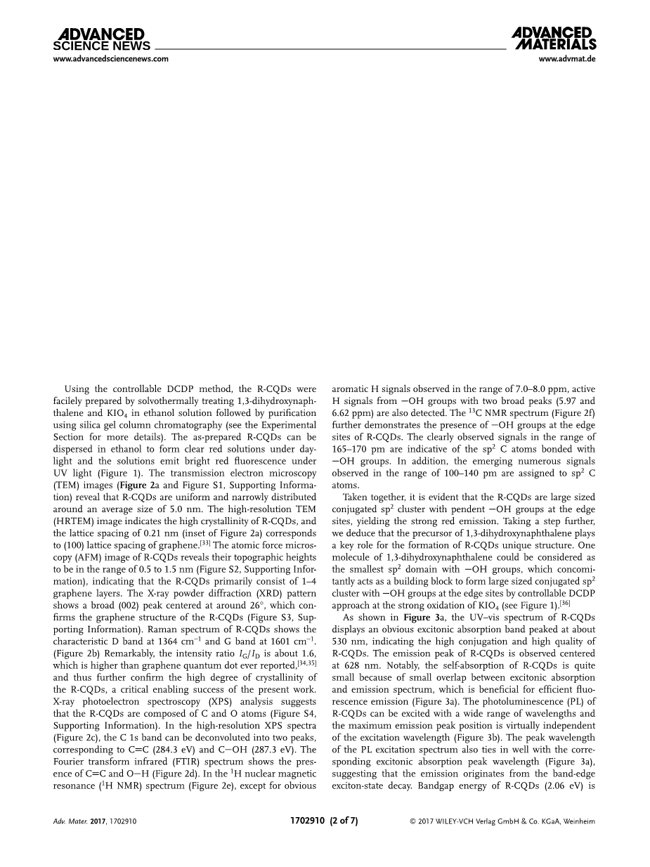 使用可控的DCDP方法,通过在乙醇溶液中溶剂热处理1,3-二羟基萘和KIO4,然后使用硅胶柱色谱(参见实验部分以获得更多细节)来纯化R-CQDs。 如此制备的R-CQD可以在白天分散在乙醇中形成澄清的红色溶液,溶液在紫外光下发出鲜红色荧光(图1)。透射电子显微镜(TEM)图像(图2a和图S1,支持信息)显示R-CQD是均匀的并且窄分布在5.0nm的平均尺寸附近。高分辨率TEM(HRTEM)图像显示出R-CQD的高结晶度,并且0.21纳米的晶格间距(图2a的插图)对应于石墨烯的(100)晶格间距。R-CQD的原子力显微镜(AFM)图像揭示了它们的地形高度。在0.5-1.5nm范围内(图S2,支持信息),表明R-CQD主要由1-4个石墨烯层组成。X射线粉末衍射(XRD)图谱显示中心在26°附近的宽(002)峰,这证实了R-CQD的石墨烯结构(图S3,支持信息)。 R-CQD的拉曼光谱显示在1364cm-1处的特征性D谱带和在1601cm-1处的G谱带。(图2b)值得注意的是,IG / ID的强度比约为1.6,高于以前报道的石墨烯量子点[34,35],从而进一步证实了R-CQD的高度结晶度,这是一个目前工作的一个关键突破点。X射线光电子能谱(XPS)分析显示R-CQD是由碳原子组成(图S4,支持信息)。在高分辨率XPS谱(图2c)中,C 1s谱带可以解卷积为对应于C=C(284.3 eV)和C-OH(287.3 eV)的两个峰。 傅里叶变换红外光谱(FTIR)显示存在C=C和O-H(图2d)。在1H核磁共振(1H NMR)谱图(图2e)中,除了在7.0-8.0ppm范围内观察到明显的芳族H信号,来自具有两个宽峰(5.97和6.62ppm)的OH基团的活性H也同样被检测到。13C核磁共振谱图(图2f)进一步表明在R-CQD的边缘位置存在-OH基团。在165-170pm范围内的信号清楚显示了sp2碳原子与-OH连接在一起。另外,在100-140pm的范围内出现的一系列信号都归属于sp2碳原子。
