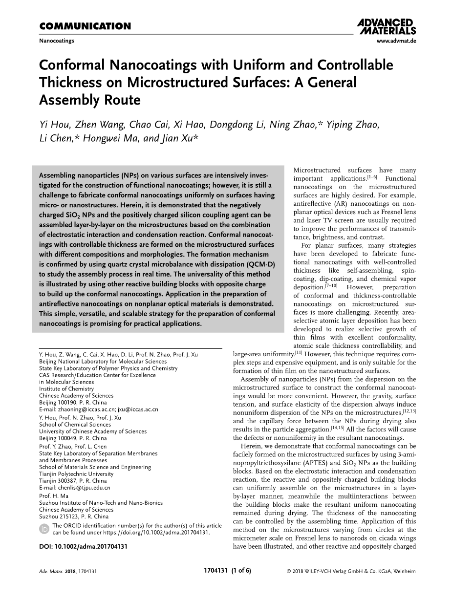 本文阐述了用三氨丙基三乙氧基硅烷和二氧化硅纳米粒子作为骨架,可以在微结构表面很容易的构建共形纳米涂层。通过静电作用和缩合反应,带异性电荷的活跃骨架粒子可以逐层的均匀形成在微结构上,同时其间的多种相互作用可以在干燥过程中维持稳定。纳米涂层的厚度可通过反应时间来控制。这种方法可运用于从菲奈尔透镜上的微米尺度到蝉翼上的纳米棒,其他带相反电荷的活跃粒子也适用,证明这种方法是具有普适性的。这种简易、普适、可扩展的方法在功能性纳米涂层和非平面基片的实际应用中有很好的前景。