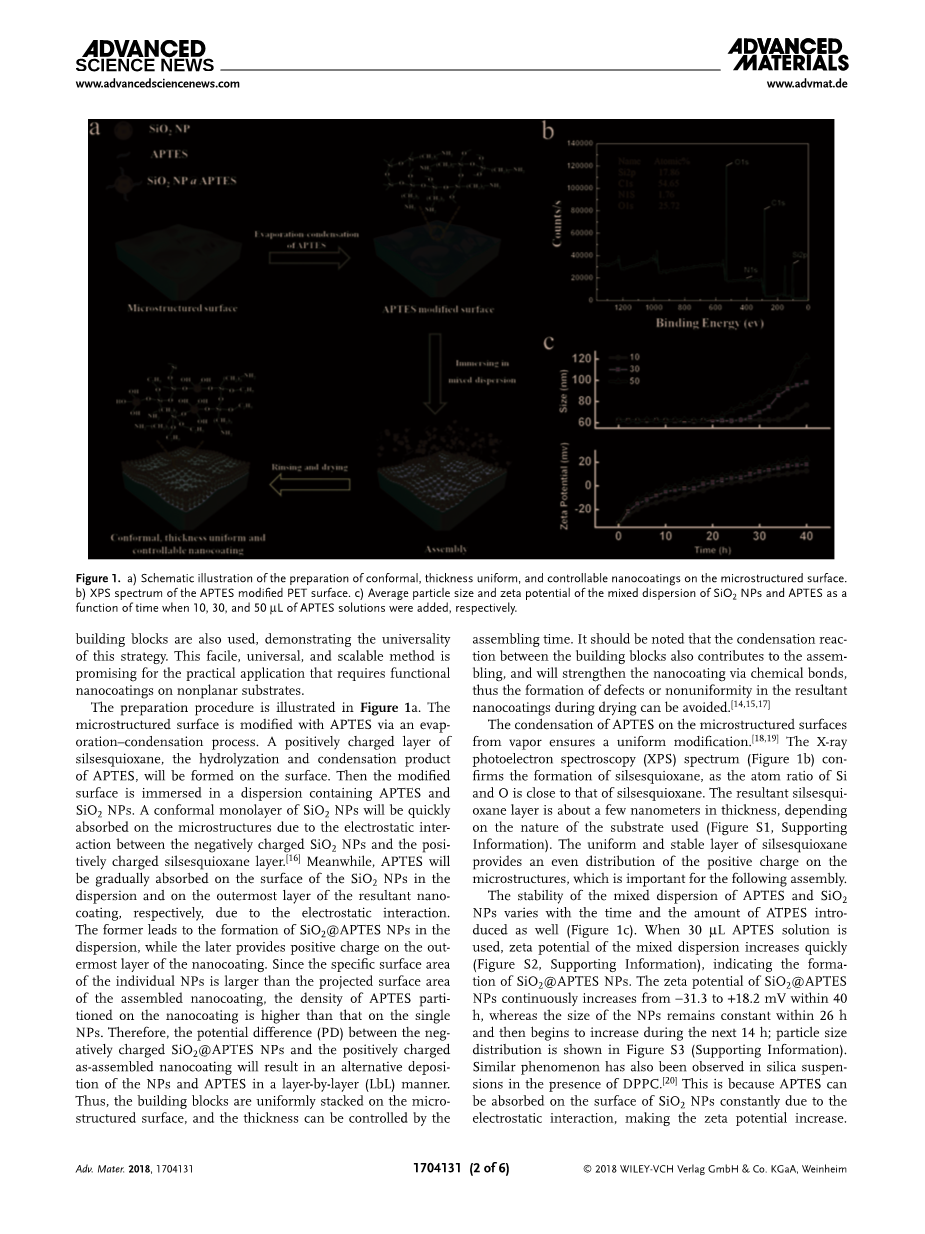 在微结构表面上的apte的冷凝可以保证均匀改性。x射线光电子能谱(XPS)光谱(图1b)证实了硅氧烷的形成,因为硅和氧的原子比接近于硅氧烷。合成的硅氧烷层厚度约为几纳米,这取决于所使用的基板的性质(图S1)。均匀和稳定硅氧烷层提供了微结构上的均匀的正电荷分布,这对下面的组装很重要。