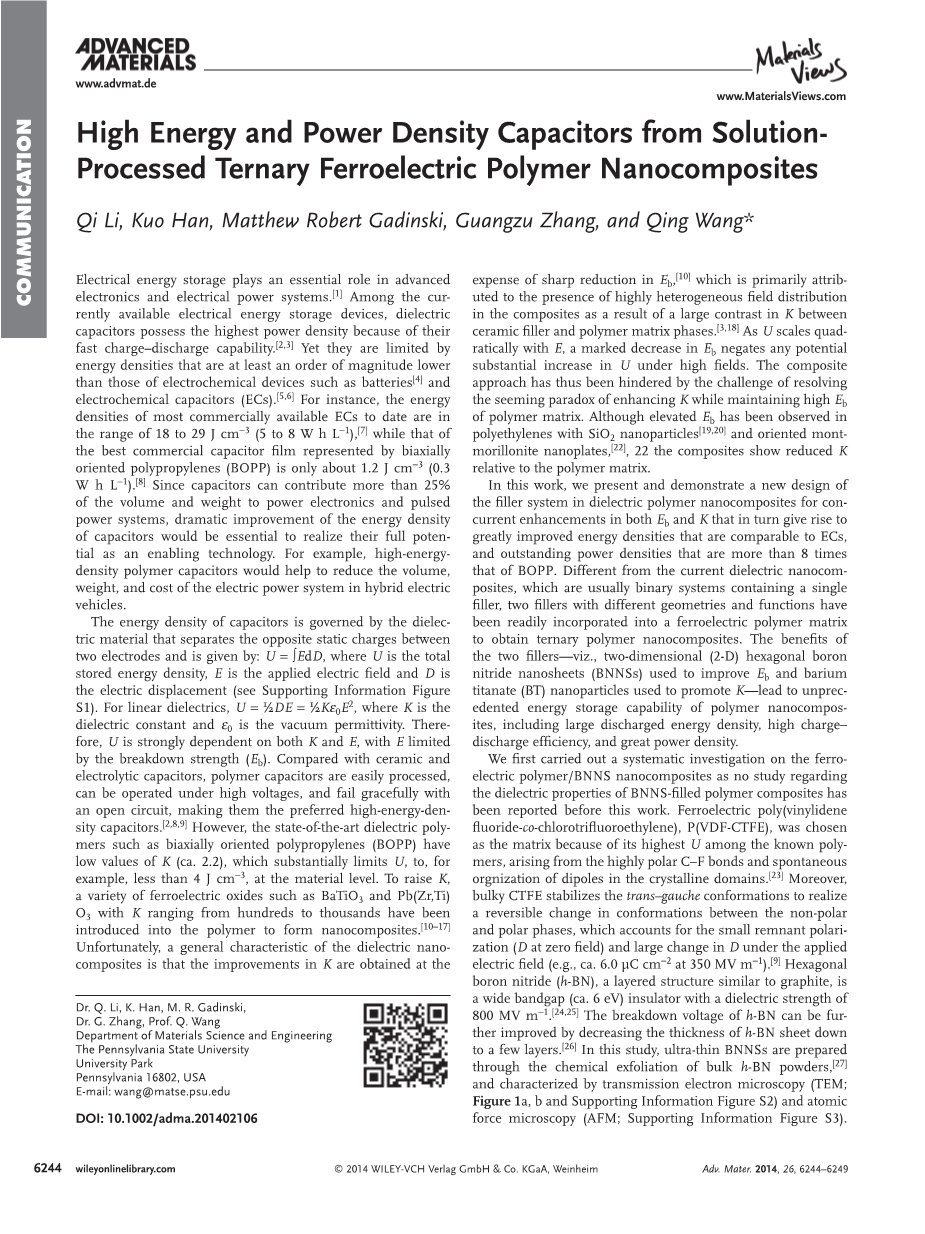 源自溶液处理的三元铁电聚合物纳米复合材料的高能量及功率密度电容器