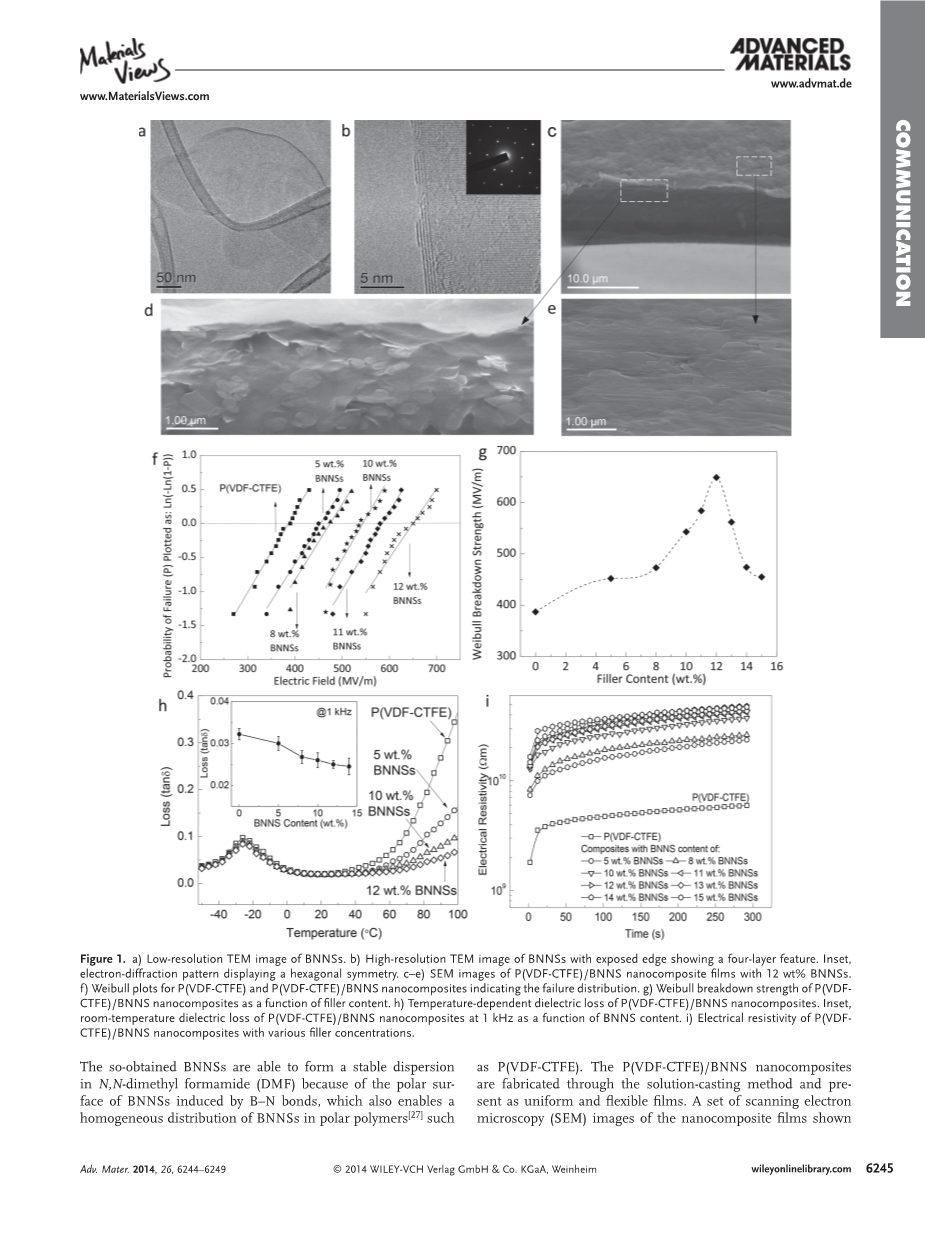 图1. a)BNNSs的低分辨率TEM图像。 b)具有显露边界BNNS的高分辨率TEM图像显示出四层特征。 插图中,显示出六角对称的电子衍射图案。 c-e)具有12wt%BNNS的P(VDF-CTFE)/ BNNS纳米复合膜的SEM图像。 f)P(VDF-CTFE)和P(VDF-CTFE)/ BNNS纳米复合材料的威布尔图表明失效分布。 g)P(VDFCTFE)/ BNNS纳米复合材料的威布尔击穿强度与填料含量的函数关系。 h)P(VDF-CTFE)/ BNNS纳米复合材料的温度相关介电损耗。 插图,P(VDF-CTFE)/ BNNS纳米复合材料在1 kHz时的室温介电损耗与BNNS含量的函数关系。 i)具有各种填料浓度的P(VDFCTFE)/ BNNS纳米复合材料的电阻率。