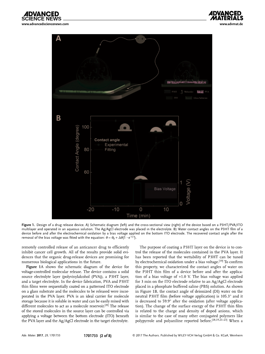 共轭聚合物在许多生物应用中都具有前景,因为它们是功能灵活,生物相容,成本效益高,可以经溶液处理以及电子或者离子导电的。一个有趣的应用是用于控制药物释放,并且之前已经使用有机电子离子泵实现了这一点。然而,有机电子离子泵显示出高的工作电压和有限的运输效率。在这里,第一次报告了低电压控制分子释放与新型有机器件基于共轭聚合物聚(3-己基噻吩)分子的释放速率可以通过施加在器件上的电压持续时间精确控制。使用便携式手机远程控制释放过程及其在递送抗癌药物以治疗癌细胞中的应用也被成功证明。该装置的工作机理归因于聚(3-己基噻吩)在水溶液中的独特可切换渗透性,通过偏压可以通过氧化或还原过程来调节聚(3-己基噻吩)的润湿性。预计有机装置可用于生物系统中可控药物递送的许多有前景的应用。