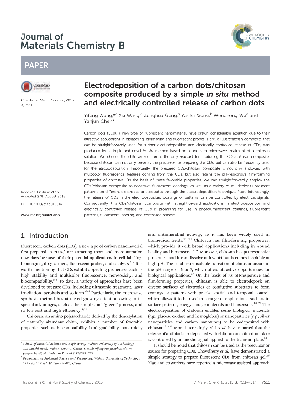 碳点/壳聚糖复合物的电沉积及碳点的电控制释放研究外文翻译资料