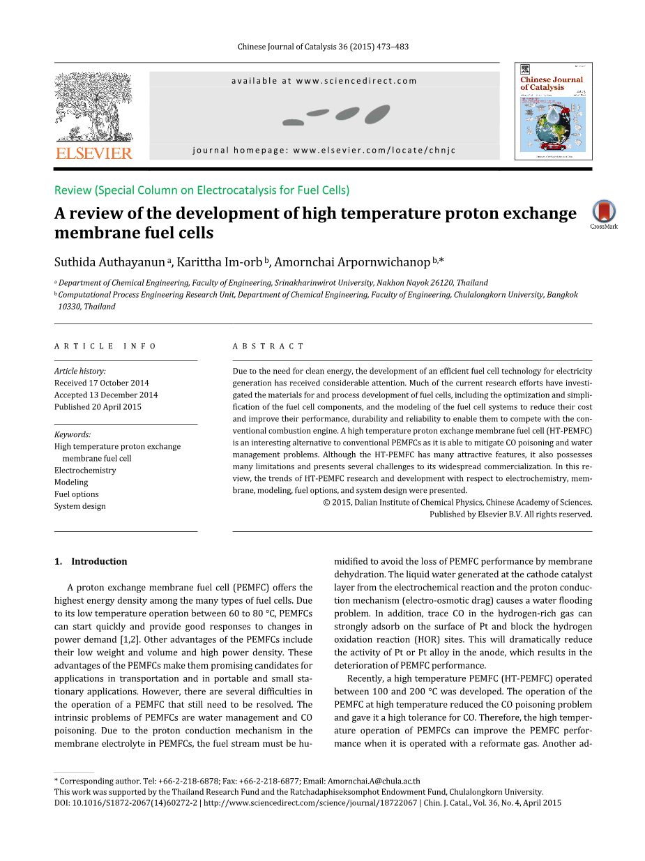 出于对清洁能源的需求,高效燃料电池技术的发展受到了相当的关注。目前的许多研究学者已经研究了燃料电池的材料和工艺开发,包括燃料电池组件的优化和简化以及燃料电池系统的建模,目的是降低成本并改善其耐用性和可靠性,使它们能够与传统的内燃机竞争。高温质子交换膜燃料电池(HT-PEMFC)是传统PEMFC的一种有趣替代品,因为它能够减轻CO中毒和水管理问题。虽然HT-PEMFC具有许多有吸引力的特征,但它也具有许多限制,并且对其广泛的商业化提出了若干挑战。在此综述中,作者介绍了HT-PEMFC在电化学、膜、模型、燃料选择和系统设计方面的研究和发展趋势。