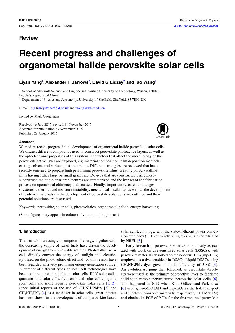摘要:我们总结有机金属卤化物钙钛矿太阳能电池的最新进展。我们讨论用于构建钙钛矿光活性层的不同化合物,以及该体系的光电特性。探讨影响钙钛矿活性层形貌的因素,如材料组成,薄膜沉积方法,溶剂组分和各种后处理技术。最近出现了用于制备高性能钙钛矿薄膜的不同方法,从而产生具有大或小晶粒尺寸的多晶薄膜。总结了使用介观结构和平面异质结结构构建的器件,并讨论了制备工艺对器件效率的影响。最后,概述钙钛矿太阳能电池的重要研究挑战(迟滞现象,热力学稳定性和湿度环境下稳定性,柔性衬底应用以及无铅钙钛矿材料的发展)并讨论了它们的潜在解决方案。