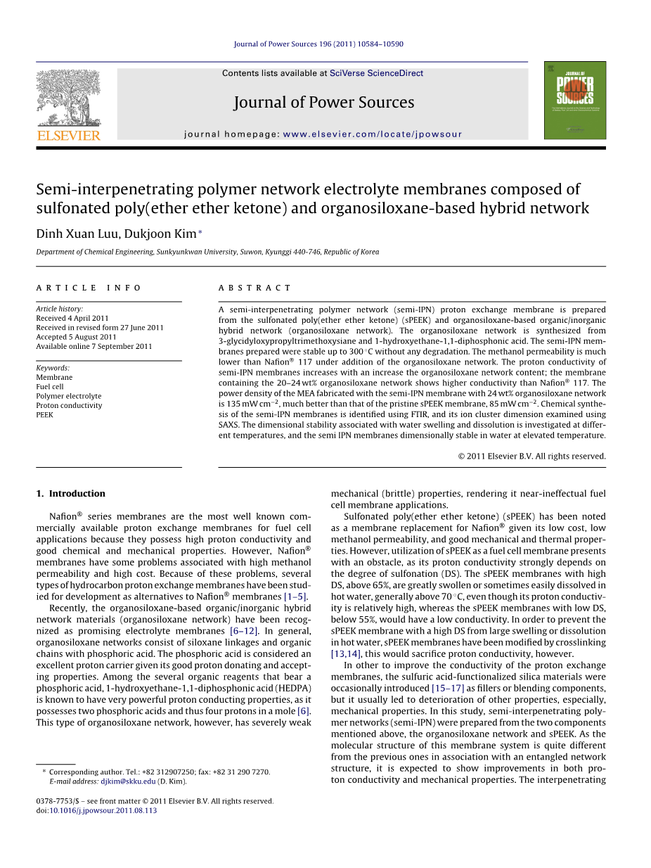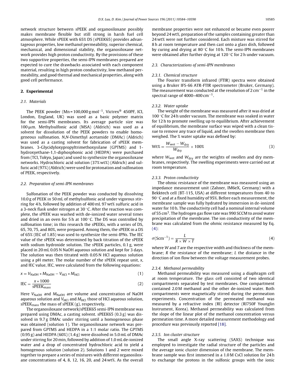另一方面,为了改善质子交换膜的电导率,偶尔引入硫酸官能化的二氧化硅材料[15–17]作为填料或混合组分,但通常会导致其他性能的劣化,特别是机械性能。在此研究中,半互穿聚合物网络(semi-IPN)由上述的有机硅氧烷网络和sPEEK两个组分制备。由于这种膜系统的分子结构与以前与缠结网络结构相关的结构截然不同,因此预计其质子传导性和机械性能均有所改善。sPEEK和有机硅氧烷之间的互穿网络结构可能使得膜在柔性但在苛刻的燃料电池气氛中依然坚固。具有65%DS(sPEEK65)的sPEEK具有优异的性能,低甲醇渗透性,优异的化学、机械和尺寸稳定性,而有机硅氧烷网络提供高质子传导率。通过这两种材料性质的支持下,预期制备的半IPN膜能够解决与每种组分材料相关的缺点,而表现出高质子传导性,低甲醇渗透性,良好的热和机械性能,以及良好的电池性能。