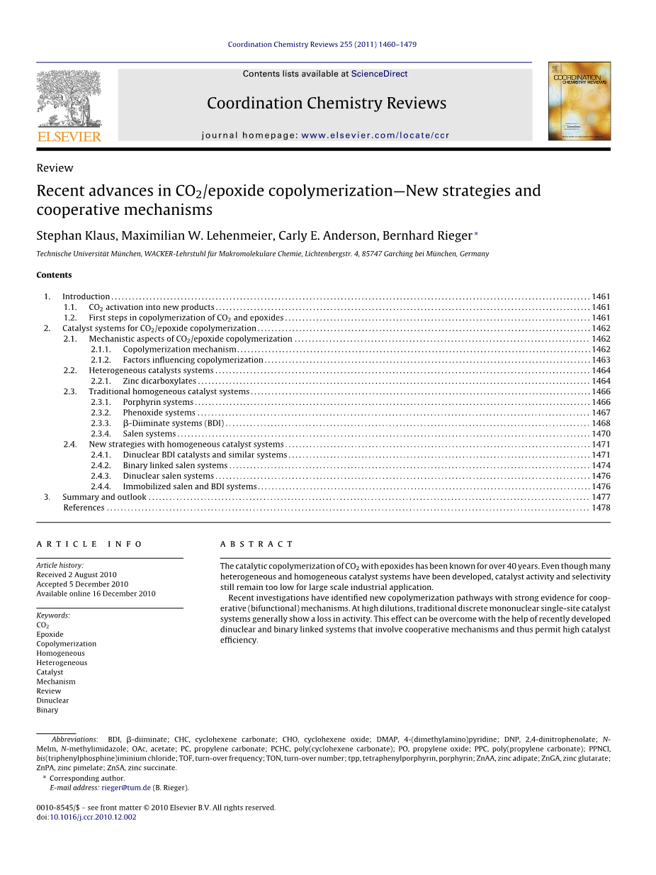 在这次审查的最后部分,概述了最新的进展和新的战略,以规避传统催化剂系统发现的问题。 这里的重点在于开发新的双核和二元连接的催化剂体系,其能够启动CO2 /环氧化物共聚合作用的机理。 此外,综述了固定均匀体系在基体上的策略。为了方便比较不同的催化体系,生产率以摩尔/摩尔的翻转数(TON)和作为翻转频率(TOF )在TONh-1。 在相关的情况下,给出了共聚的选择性和生成的聚合物的相应质量。