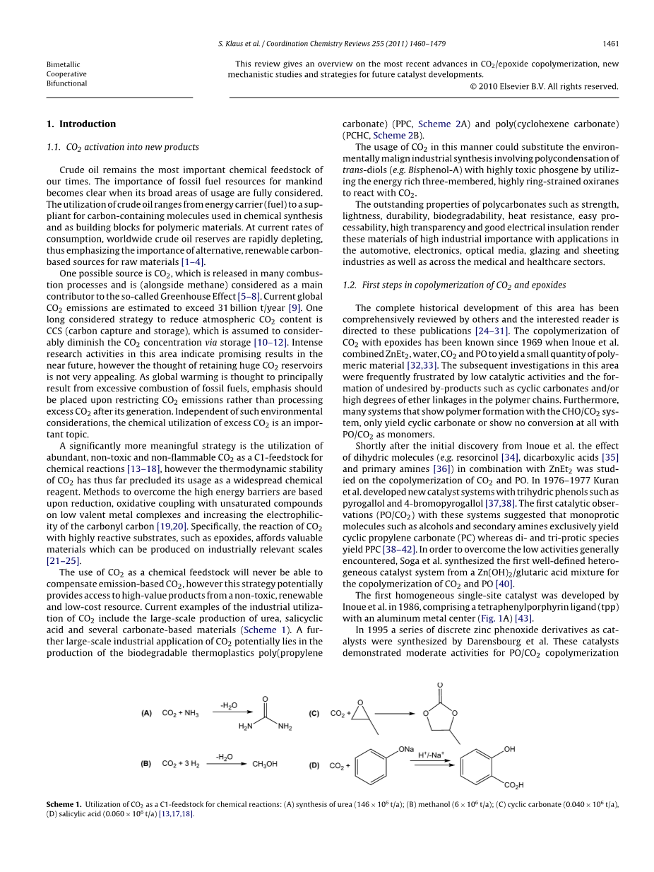 使用二氧化碳作为化学原料将永远无法补偿基于二氧化碳的排放,但是这一战略可能为无毒,可再生和低成本资源的高价值产品提供必要条件。目前CO2工业利用的例子包括大规模生产尿素,水杨酸和几种碳酸盐基材料(方案1)。CO2的进一步大规模工业应用可能在于生物可降解热塑性聚碳酸丙烯酯(PPC,方案2A)和聚(环己烯碳酸酯)(PCHC,方案2B)的生产。