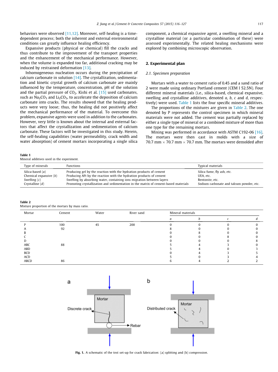 膨胀产品(物理或化学)能够填补裂缝从而有助于提高运输性能并提高机械性能。然而,当体积膨胀太大时,可能会发生由约束变形引起的破裂[6]。不均匀成核发生在溶液中的碳酸钙沉淀期间。结晶,沉淀主要是碳酸钙的动力学晶体生长受温度,浓度,溶液pH值和二氧化碳的分压的影响。Kishi[7]等人使用碳酸盐,如Na 2 CO 3和Li 2 CO 3,以加速钙的沉积变成裂缝。结果表明,愈合产品很松散,因此愈合对材料的机械性能没有积极的影响。除了碳酸盐之外,还使用了膨胀剂来克服这个困难。然而,对影响钙的结晶和沉淀碳酸盐的内部和外部因素知之甚少。这些因素将在本研究中进行调查。水泥与砂浆组分,化学膨胀剂[8],膨胀矿物或结晶材料混合的自愈能力(透水性,裂纹宽度和吸水性)也将在这里进行实验评估。相关的愈合机制是通过显微镜观察进行探索。