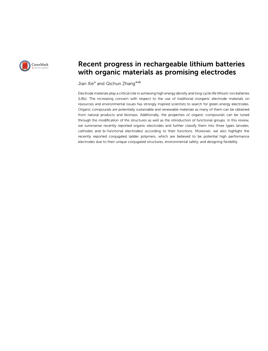 令人惊讶的是,最近的研究表明,它们的电化学性能包括能量密度,功率密度和循环稳定性与传统无机材料相当或甚至更好。与无极电极材料相比,对高性能有机材料的研究仍处于早期阶段,许多研究人员可能不熟悉。尽管已经发表了几篇关于有机材料的综述,但是在文献中没有发现根据有没有无机材料参与来将这些材料分为三种种类型(正电极,负电极,双功能电极),在本综述中,有机材料分为正极材料,负极材料和双功能电极材料。 更具体地,为了更好的研究,将它们进一步分成几个子组。 此外,还包含最近报道的高性能有机电极还将被详细介绍,并对他们的机理,设计方法和电化学性能进行详述和比较