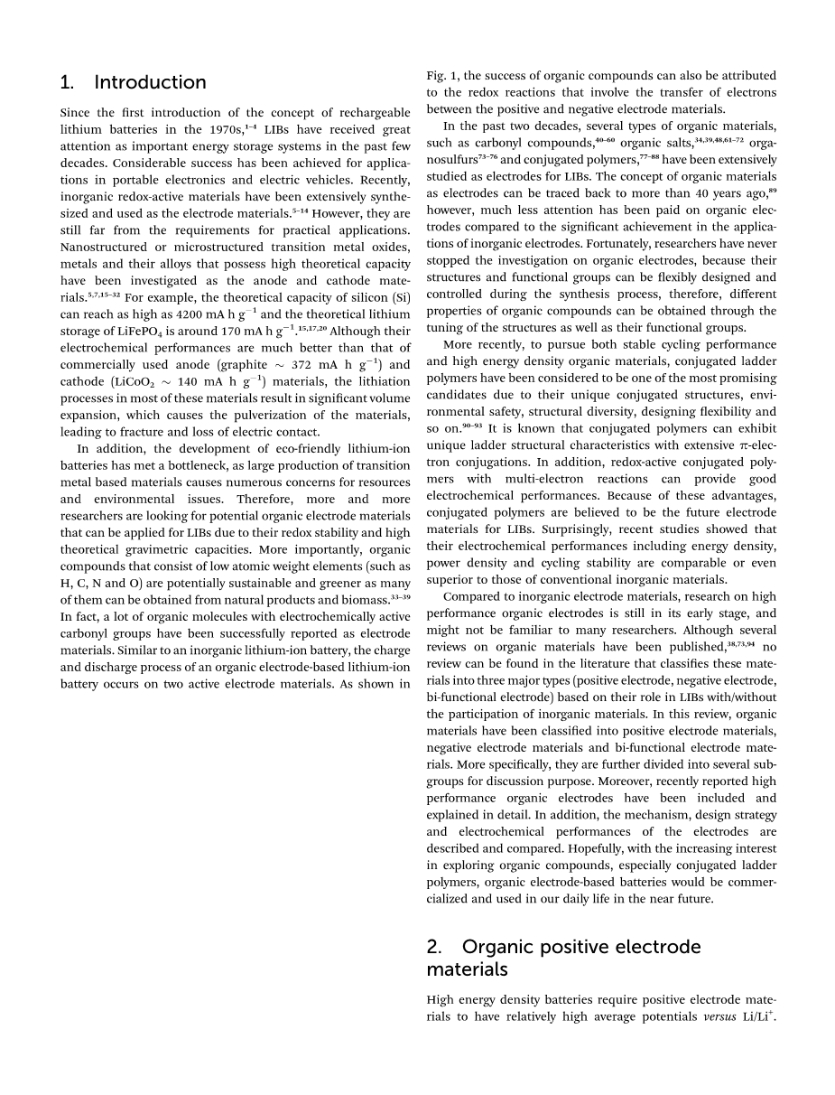 在过去的二十年中,羰基化合物,有机盐,有机硫和共轭聚合物这几类有机材料已作为LIBs的电极被广泛研究。有机材料作为电极的想法在40年前就被提出了,然而,与无机电极在应用中的显著成就相比,对有机电极的关注甚少。幸运的是,研究人员从来没有停止对有机电极的研究,因为有机物的结构和官能团可以在合成过程中灵活设计和控制,因此,可以通过调节有机物的结构和官能团来得到不同性质的有机物。