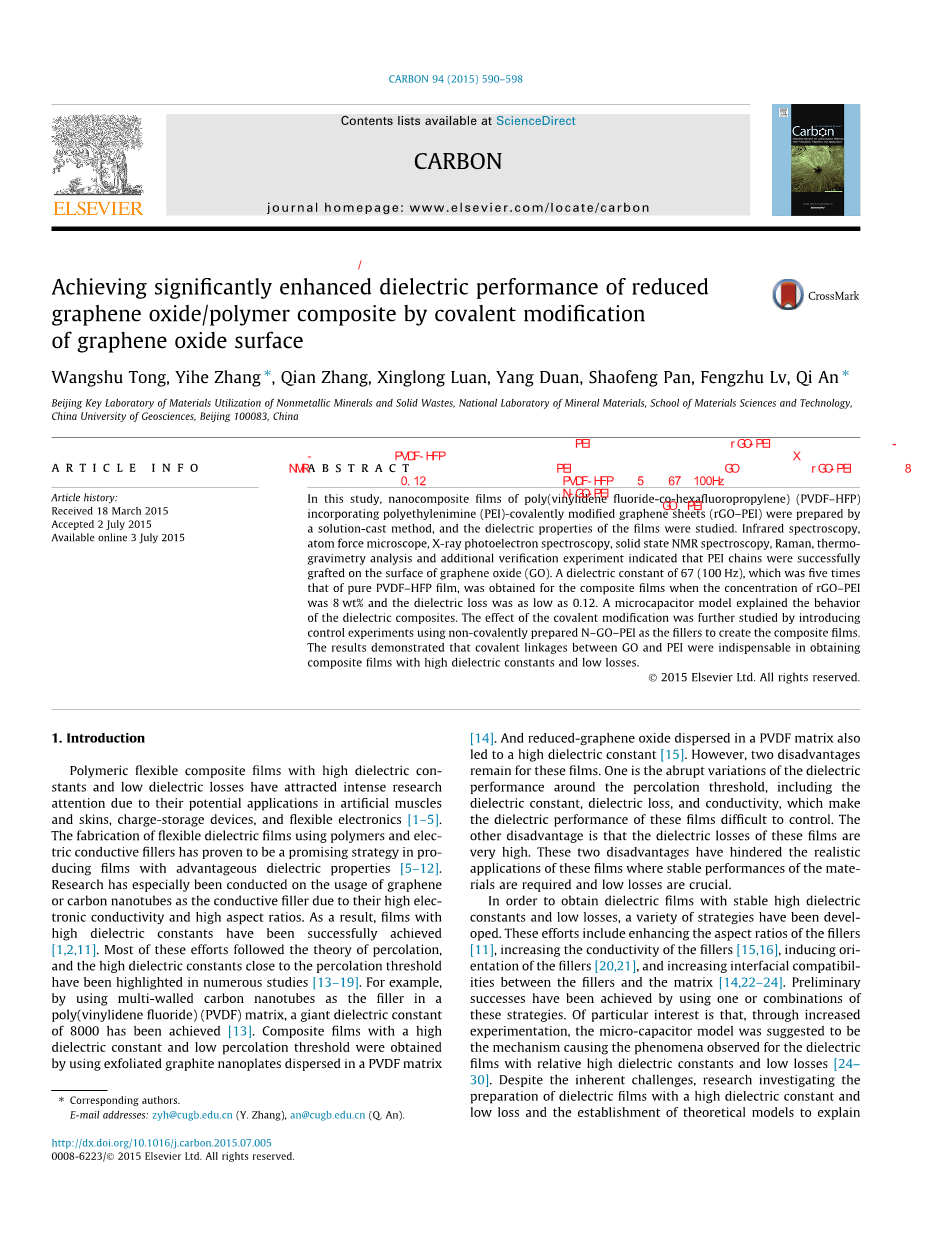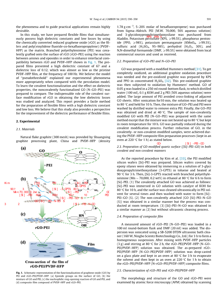 在这项研究中,通过用化学还原法制备的还原氧化石墨烯(rGO)作为填料以聚偏二氟乙烯-六氟丙烯)(PVDF-HFP)作为基质,制备了同时具有高介电常数和低介电损耗的柔性薄膜。利用胺和环氧化物之间的反应将支化的聚乙烯亚胺(PEI)共价接枝到rGO(rGO-PEI)的表面上,以提高rGO和PVDF-HFP之间的界面相容性,如图1所示。该柔性薄膜在100Hz的频率下具有高达67的高介电常数和0.12的低介电损耗,其介电损耗几乎与原始PVDF-HFP膜一样低。我们认为,“渗流阀值”模型比渗透模型更适合解释该薄膜的介电机制。通过与未经共价表面改性的GO(N-GO-PEI)的膜进行比较,了解了PEI共价修饰对介电性能的影响。结果表明rGO的共价表面改性对薄膜的低介电损耗具有不可或缺的作用。这项研究提供了一种用于制备具有高介电常数和低介电损耗的柔性膜的简单方法。同时,这项研究还对如何改进柔性膜的介电性能的有巨大的参考价值。