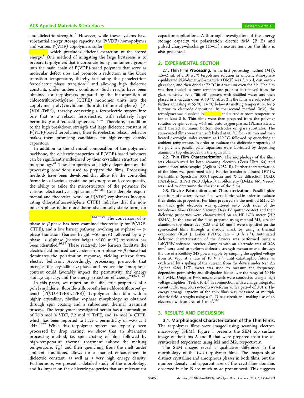 在本文中,我们报道了P(VDF-TrFE-CTFE)薄膜的高度结晶和纤维状,通过旋涂法和随后的热处理工艺处理使其晶体结构呈 ɑ 相。本文研究的三元共聚物化学组成是78.8 mol%VDF、7.2 mol%TrFE和14 mol%CTFE,其据报道在1KHz条件下介电常数大于50 [19,29]。虽然这种三元共聚物材料通常是通过滴铸加工,我们展示了一种加工方法可以作为替代方案,即通过膜的旋涂高温热处理(高于熔化温度Tm),然后熔体骤冷,可以明显的增强介电常数和提高能量密度。此外,我们提出了形态的详细研究及其对于电容器介电性能应用的相关影响。彻底研究能源存储容量通过极化电场(P-E)和脉冲充放电(C-D)测量的方法也被提出。