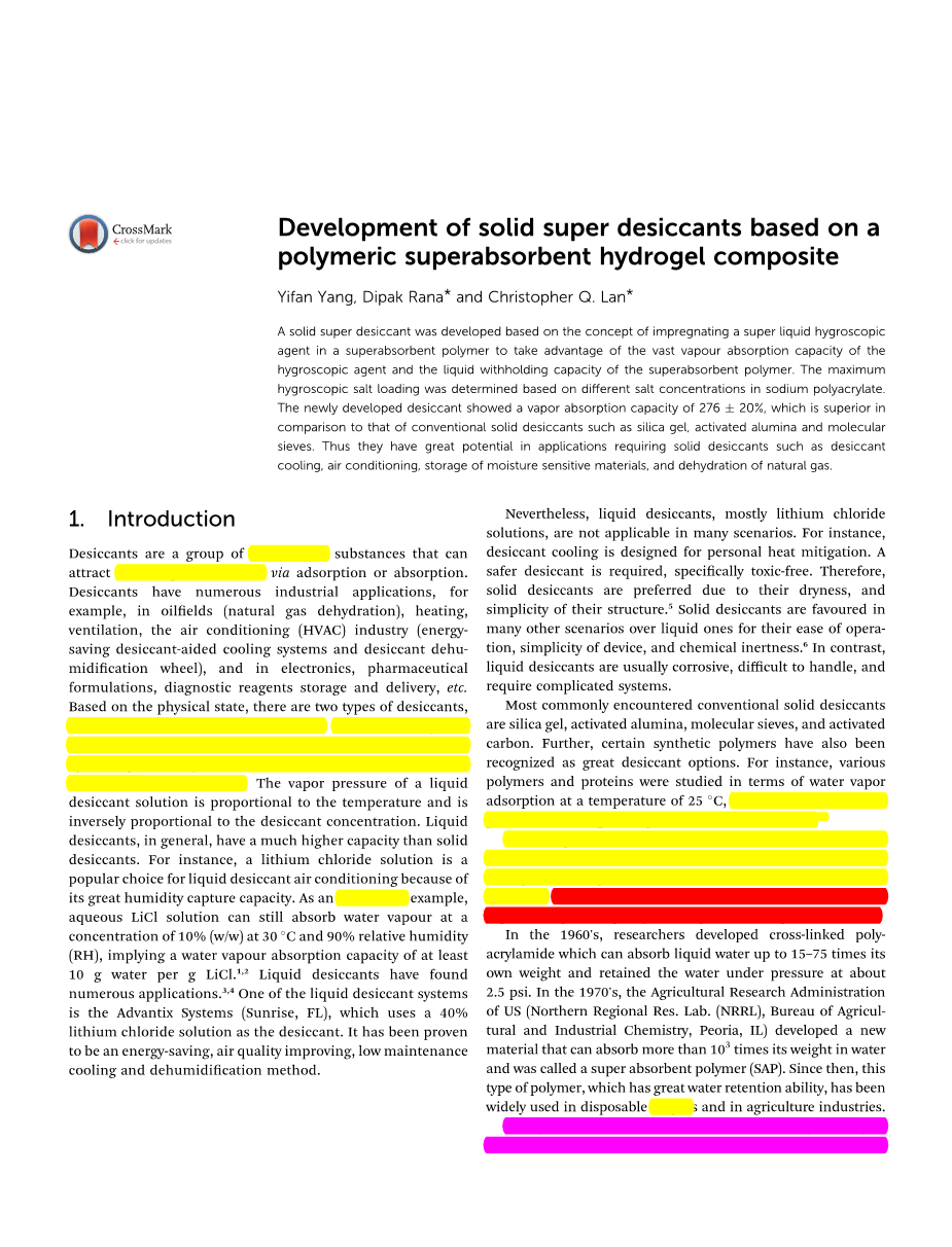 液体干燥剂的吸收能力,创造一种超级固体干燥剂。为了开发一种高效、无腐蚀性、易再生的超固体干燥剂,我们提出了一种以聚丙烯酸钠为基础的高吸水性水凝胶复合材料(SHC),并以吸湿剂(氯化锂)为浸渍材料,作为一种新型的固体干燥剂材料。 SHC具有氯化锂的吸收能力大、固液性能好等优点。 此外,商用聚丙烯酸钠每公斤约有10$,价格与商用硅胶相当。 这种新开发的干燥剂在石油屏蔽、暖通空调等行业具有很大的应用潜力。、