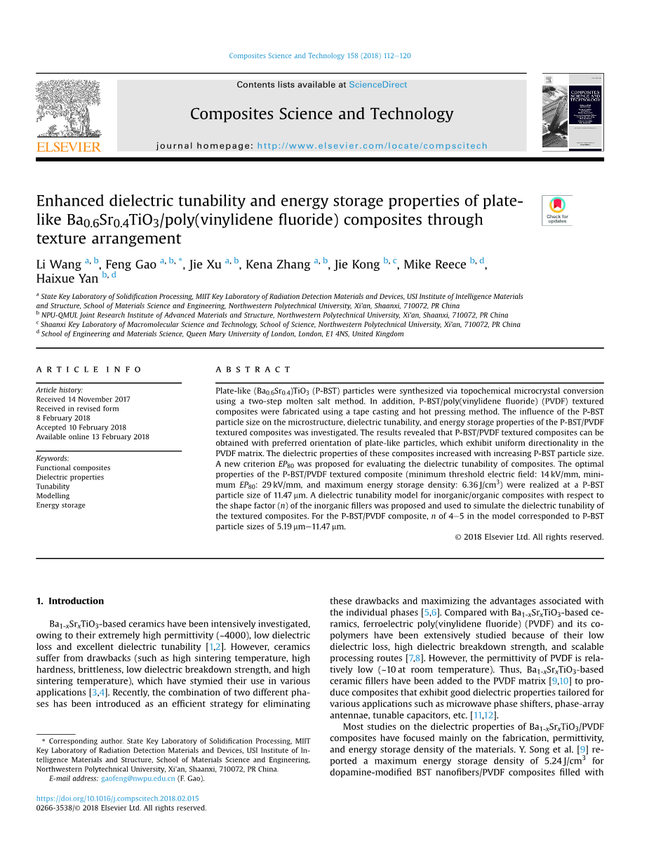 通过织构排列增强Ba0.6Sr0.4TiO3/聚偏氟乙烯板状复合材料的介电可调性和储能性能