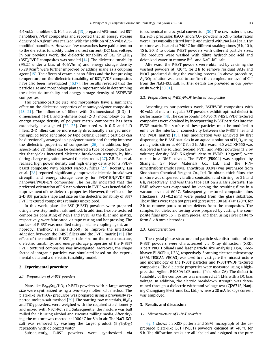 陶瓷颗粒的大小和形貌对陶瓷/聚合物复合材料的介电性能有显著影响[18-21]。0维(0-D)、1维(1-D)和2维(2-D)形态的填料对聚合物基复合材料储能密度的影响已被广泛研究[22-25]。与0-D和1-D填料相比,2-D填料在铸带作用下更容易定向排列。陶瓷颗粒可以定向排列在聚合物基体中,从而提高复合材料[26]的介电性能。此外,高纵横比2D填料可以被认为是一种导电屏障,它通过阻碍电荷向电极[27]迁移而提高了介电击穿强度。Z.B.Pan等人利用片状NaNbO3填料[27]实现了PVDF基复合材料的高功率密度和高能量密度。最近,刘等人[28]报道了PVDF-BN/PVDF-BST纳米线/PVDF-BN复合材料的介电击穿强度和能量存储密度显著提高。结果表明,氮化硼纳米片在PVDF中的择优取向有利于提高其介电性能。然而,二维BST颗粒形状和尺寸对BST/ PVDF织构复合材料介电可调性的影响仍未得到研究。本工作采用两步熔盐法制备了片状BST (P-BST)粉末。采用带式铸造和热压法制备了以P-BST为填料和PVDF为基体的柔性织构复合材料。采用硅烷偶联剂氨基丙基三乙氧基盐水(KH550)对P-BST表面进行改性,以改善P-BST填料与PVDF基体[15]之间的界面附着力。研究了改性P-BST颗粒尺寸对P-BST/ PVDF织构复合材料微观结构、介电可调性和储能性能的影响。此外,根据实验数据和介质可调谐模型,对无机颗粒的形状因子进行了模拟。