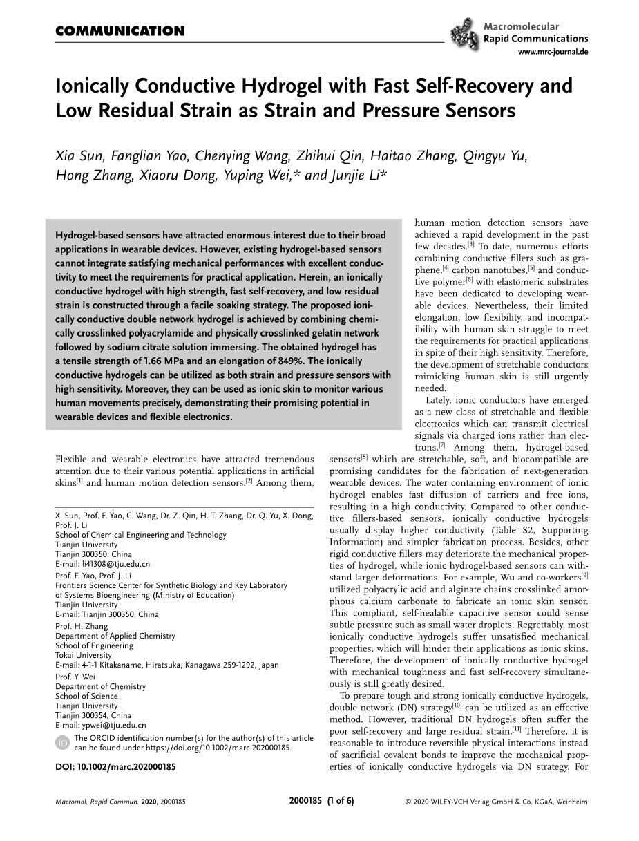 由于水凝胶传感器在可穿戴设备中的广泛应用,引起了人们的广泛关注。然而,现有的水凝胶传感器不能将良好的力学性能与优良的导电性结合起来,以满足实际应用的要求。本文通过简单的浸泡策略,构建了一种具有高强度、快速自恢复、低残余应变的离子导电水凝胶。采用化学交联聚丙烯酰胺和物理交联明胶网络相结合,柠檬酸钠溶液浸泡制备出离子导电双网络水凝胶。得到的水凝胶拉伸强度为1.66 MPa,伸长率为849%。离子导电水凝胶既可以作为高灵敏度的应变传感器,也可以作为压力传感器。此外,它们还可以用作离子皮肤,精确监测人体的各种动作,显示出它们在可穿戴设备和柔性电子产品方面的潜力。