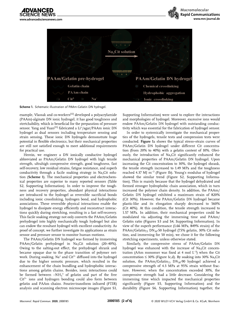 将PAAm/明胶预水凝胶浸泡在Na3Cit溶液(20-40%)中形成PAAm/明胶DN水凝胶。由于盐析作用,预水凝胶因聚合物网络的相变而收缩、不透明。浸泡过程中,Na 和Cit3minus;由于渗透压升高而扩散到水凝胶中,使明胶链间的捆绑和疏水相互作用增强。明胶的-NH3 与部分游离的Cit3minus;离子形成离子相互作用,明胶与PAAm链形成氢键。傅里叶变换红外(FTIR)分析和扫描电镜图像(图S1,支持信息)研究了水凝胶的相互作用和形貌。此外,过量的离子会使PAAm/明胶DN水凝胶具有优异的导电性,这是制备水凝胶传感器必不可少的。