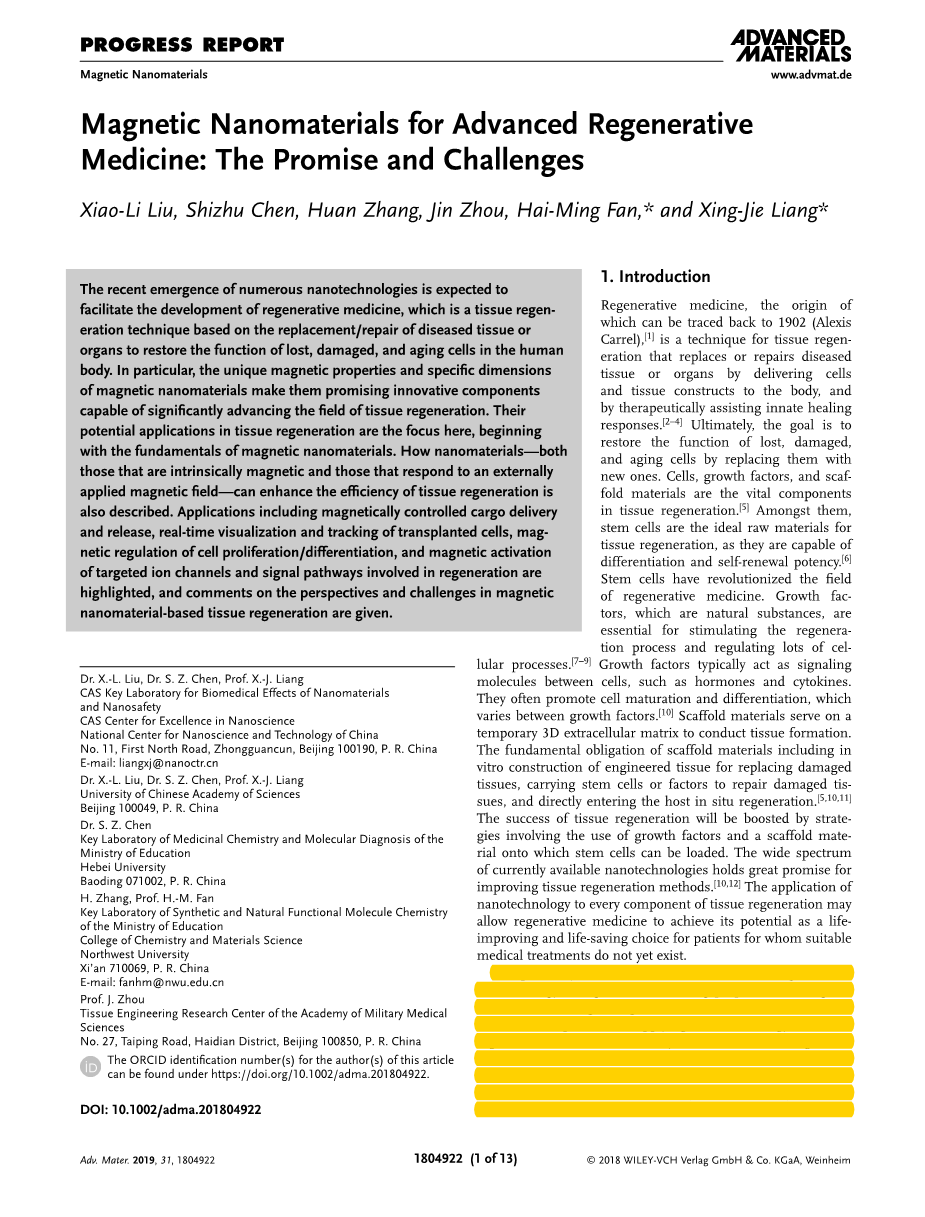 过去的20年见证了纳米生物技术的蓬勃发展,这要归功于无机纳米材料因其降维而产生的迷人特性。近年来,纳米技术在组织再生中的应用主要集中在利用新型功能无机纳米材料输送细胞和组织、实时监测组织再生过程和提高治疗效果等方面。经批准的纳米医学方法证明,基于纳米颗粒的组织再生的成功应用在于纳米颗粒的智能设计,具有量身定做的特性,可实现更有效和更安全的治疗。特别是,上述优点引起了人们对磁性氧化铁纳米颗粒(磁性氧化铁纳米颗粒)的进一步开发的越来越多的关注,除了它们在临床前和临床环境中作为成像和治疗剂的广泛使用之外。微离子在组织再生研究中的重要应用包括但不限于:1)磁控输送和按需释放组织再生所需的货物;2)使用磁性氧化铁纳米颗粒进行移植细胞的实时可视化与跟踪;3)移植细胞黏附、增殖和分化的磁调节;以及4)靶向再生相关离子通道和信号通路的磁激活,例如量子点,和碳纳米管,磁性氧化铁纳米颗粒磁性氧化铁纳米颗粒不仅表现出良好的生物相容性,而且具有靶向递送、诊断和治疗的综合能力。因此,基于磁性氧化铁纳米颗粒的技术的发展为解决再生医学中未得到满足的需求提供了可能性,例如控制工程干细胞的命运、作用和功能,以实现体内治疗效果。然而,这一领域的进展缓慢,新进展有限,部分原因是磁性氧化铁纳米颗粒的这些独特功能远未得到充分利用。