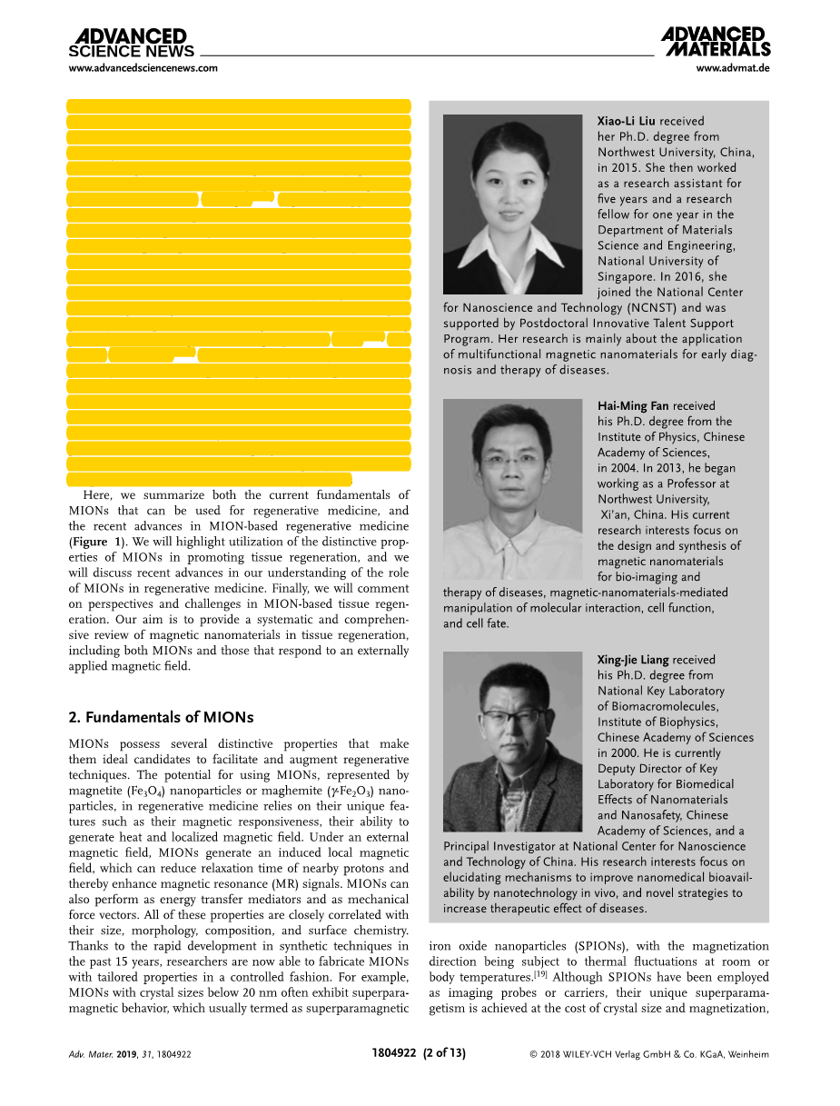 在这里,我们总结了目前可用于再生医学的磁性氧化铁纳米颗粒的基本原理,以及基于磁性氧化铁纳米颗粒的再生医学的最新进展(图1)。我们将强调微离子在促进组织再生方面的独特特性的应用,并将讨论我们对微离子在再生医学中作用的理解的最新进展。最后,我们将对基于磁性氧化铁纳米颗粒的组织再生的前景和挑战进行评论。我们的目标是对组织再生中的磁性纳米材料进行系统和全面的综述,包括磁性纳米材料和那些对外部磁场有响应的磁性纳米材料。