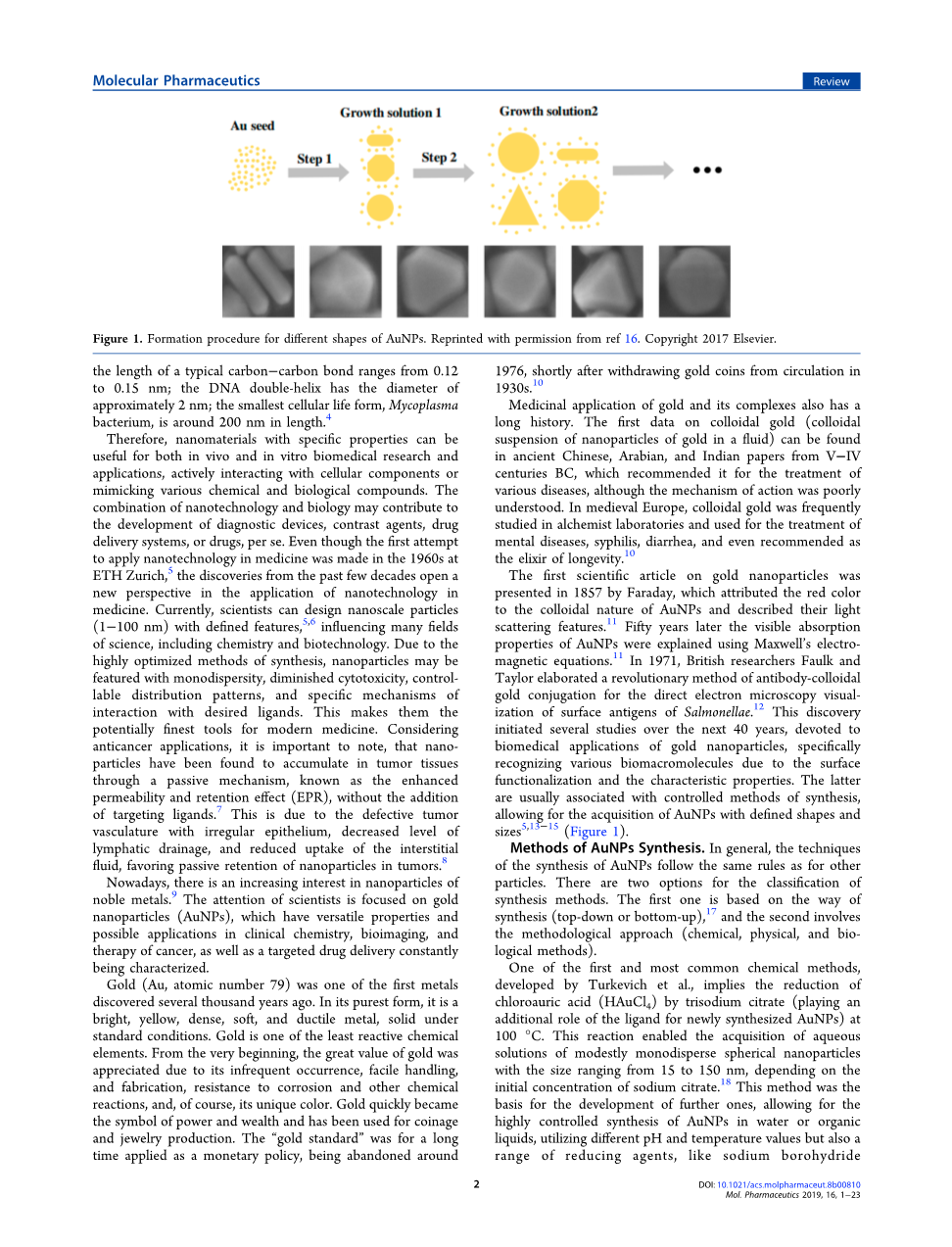 1150 年后,Maxwell 的电磁方程解释了AuNPs 的可见吸收特性。111971 年,英国研究人员 Faulk 和 Taylor 阐述了一种革命性的抗体-胶体金偶联方法,用于直接电子显微镜可视化沙门氏菌的表面抗原.12这一发现引发了未来 40 年的几项研究,致力于金的生物医学应用,特别是由于表面纳米粒子的功能性和特征性特性而识别各种生物大分子。后者通常与控制的合成方法有关, 可以获得具有确定形状和大小的 AuNPs(图1)