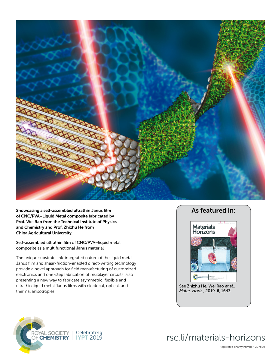 本文提出了世界上第一种集导电性、光学性和热各向异性为一体的液态金属(LM)双面薄膜。当前工作的前提是,我们在没有任何界面设备或辅助设备帮助的情况下,首次展示了双面薄膜的自组装合成。该膜可以用作全新的底材油墨一体化的电子纸,并为制造多层复杂电路提供了便捷、快速的平台,这些电路可以用于创建智能的微型传感器。与机械烧结的方法相比,使用剪切摩擦的方法可以使定制电路具有更高的分辨率。此外,液态金属双面薄膜的光学和热各向异性的特性使其有可能用于光转换开关和温度调节器。 这就使得液态金属在科学与技术上的有用有着更好的前景,并在将来可以实现多样化和非常规的应用。
