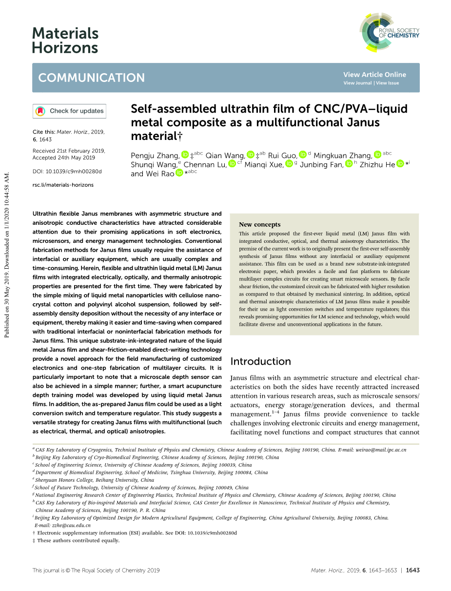 双面薄膜因其具有非对称结构和两侧电特性而在最近的许多研究领域引起了越来越多的关注,如微型传感器/执行器、储能/发电设备和热管理。1-4双面薄膜为解决关于电子电路和能量管理的问题提供了方便,它还具有传统材料无法实现的新颖功能和紧凑结构。例如,为了防止内部短路故障,多层电路的制造需要一个额外的绝缘层来隔离两个相互平行的平面(adressing planes);5隔离这两个平面通常需要几个不合理的、低效的程序。相反,具有不对称电特性的双面薄膜就可以使得多层电路一步制造成为可能。此外,超薄独立的双面薄膜在柔性传感器中具有重要的潜在应用,它即使在有限的空间内也能实现复杂的功能。
