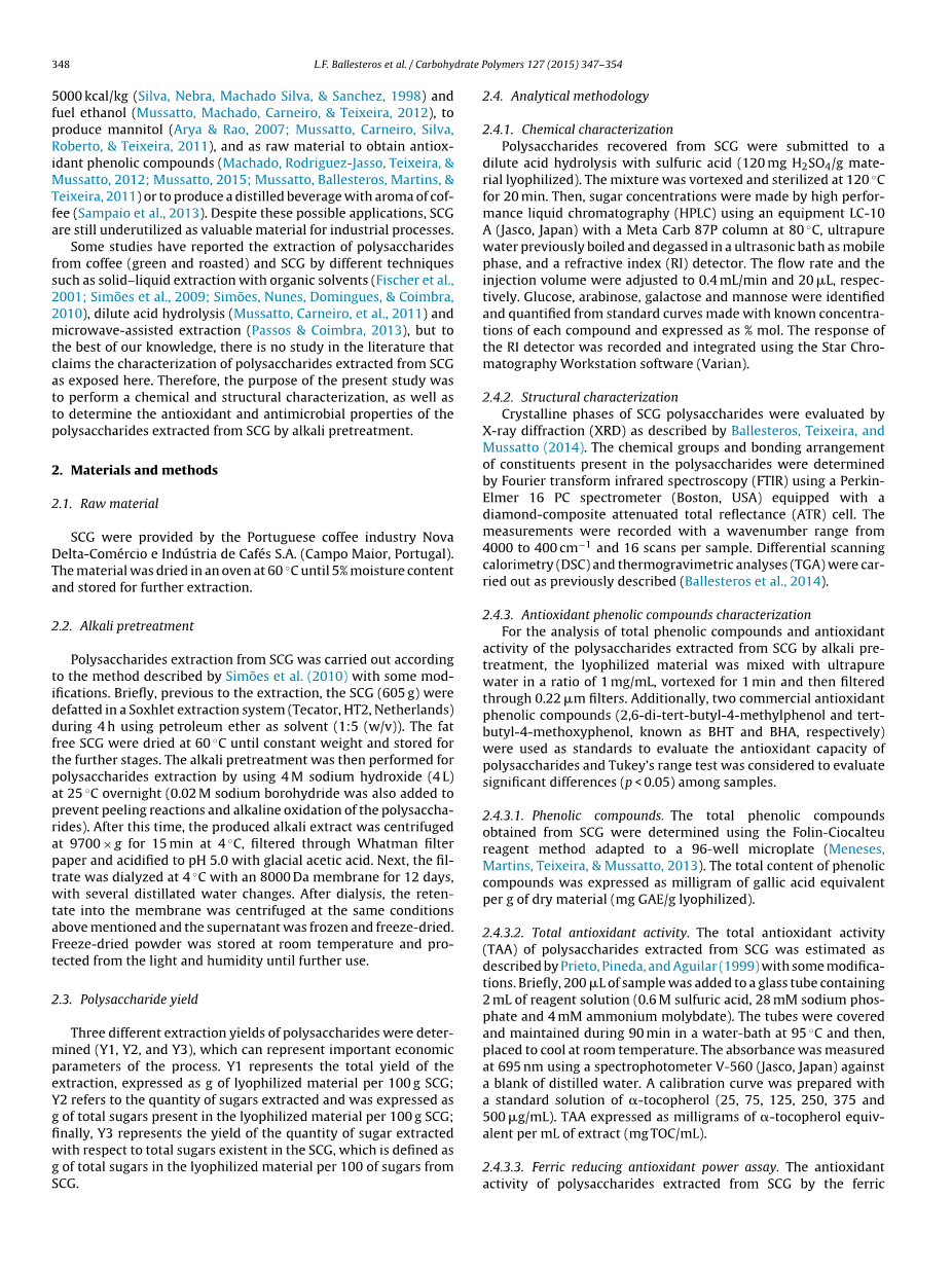 一些研究报道了多糖的提取从咖啡(生的和烤的)和SCG中通过不同的技术例如用有机溶剂进行固液萃取(Fischer等人,2001年;西蒙等人,2009年;西蒙,多明格斯,科英布拉,2010年),稀酸水解(Mussatto,Carneiro等人,2011年)和微波辅助提取(Coimbra,2013),但是据我们所知,文献中没有研究声称从SCG中提取的多糖的特性把他们暴露在这里。因此,本研究的目的是进行化学和结构表征,以及测定其抗氧化和抗菌性能碱预处理法提取SCG多糖。