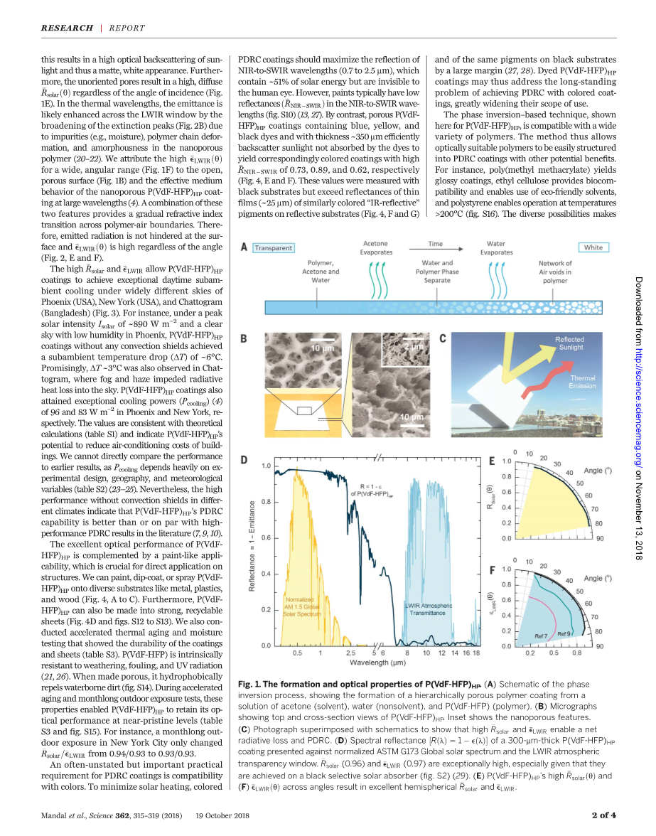 近几十年的研究已经产生了各种PDRC设计,包括复杂的发射涂层,如光子结构,介质,聚合物和聚合物介电复合材料在金属反射镜(5-11)。虽然效率高,但这些设计成本高,容易腐蚀。此外与油漆不同,它们是预制的,不能直接应用于现有的屋顶或墙壁,这些屋顶或墙壁具有不同的成分、纹理和几何形状(7、9、10)。因此,冷顶涂料(CRPs)结合了适度的光学性能,适用性广泛和价格不昂贵,仍然是PDRC的基准(12-15)。然而,由嵌入在聚合物基体中的介电颜料(如二氧化钛和氧化锌)组成的CRPs由颜料的紫外(UV)吸收率和低的近-短波长红外(NIR至SWIR,(lambda;)0.7至2.5 mu;m)反射率而具有较低的太阳反射率通常为(0.85)(13)。我们认识到,用光散射气孔代替CRPs中的颜料不仅可以消除这一问题,并将光学性能提高到最先进的水平,而且可以避免与颜料相关的材料、加工和环境成本的冲突(14,16)。受到这一想法的启发,我们报道了一种简单、可扩展、廉价的基于相反转的方法,用于制造具有优异Rsolar和ELWIR性能的多级多孔聚合物涂层。具体来说,我们使用分级多孔聚偏氟乙烯-共六氟丙烯[P(VdF-HFP)Hp],实现了不依赖于底物的半球形Rsolar=0.96plusmn;0.03, ELWIR=0.97plusmn;0.02。结果表明,在太阳强度为890 Wm-2和750 Wm-2的条件下,其亚环境降温能力为6 ℃,平均冷却功率为96 Wm-2。性能与以前的报告相同或超过(7,9,10)。由于制造技术是基于室温和溶液的,多孔聚合物涂层可以通过传统的方法应用,如喷涂和喷涂在不同的表面,如塑料,金属和木头。此外,它可以加入染料,以达到理想的颜色和冷却性能之间的平衡。涂层的性能和该技术类似油漆的方便性使其成为实现高性能PDRC的可行方法。