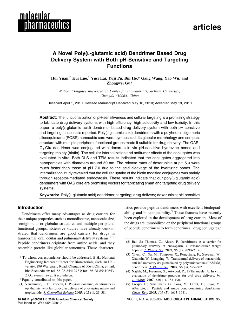 由于肿瘤组织周围的环境是酸性的,抗肿瘤药物传递系统需要具有pH敏感性和靶向性的药物载体。肽树枝状大分子作为抗肿瘤药物载体有许多优点。肽树突状分子的外周官能团不仅可以固定靶向分子,而且可以将抗肿瘤药物与pH敏感键连接起来。肽树状大分子因此提供了一个有用的平台,方便地制造智能靶向药物传递系统。本文报道了具有OAS核的聚(L-谷氨酸)树枝状大分子的合成及表征。阿霉素(DOX)是一种广泛应用的抗肿瘤药物,通过pH敏感的腙键与树突状大分子的外周基团结合。此外,生物素被固定在树突状大分子上,成为一种靶向部分的特异性肿瘤细胞。由此制备了具有双靶向和pH敏感功能的多聚L -谷氨酸树枝状偶联物。我们还报告了药物释放、抗肿瘤作用和偶联物的细胞内化的后续研究。