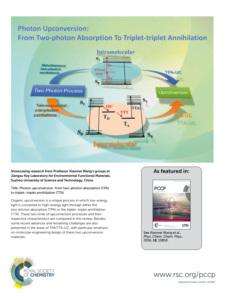 另一种有机上转换是三重态湮灭上转换(TTA-UC)。该TTA-UC需要含有三重态敏化剂和三重态受体的双分子系统.敏化剂首先吸收低功率光,然后经历系统间跃迁(ISC),并进一步将其三线态能量转移到三线态受体(TTT)。随后两个附近的三重态受体经历三重态湮灭(TTA),产生上变频荧光(即TTA上转换).由于TTA-UC经历了分子间两个相应的单光子过程,只需要低激发强度就可以进行转换(小于100 mW cm2,太阳能就足够了)。因此,用于太阳能应用,包括光伏,光合作用和光催化等领域是有可能实现的的。