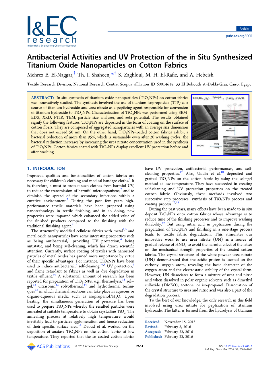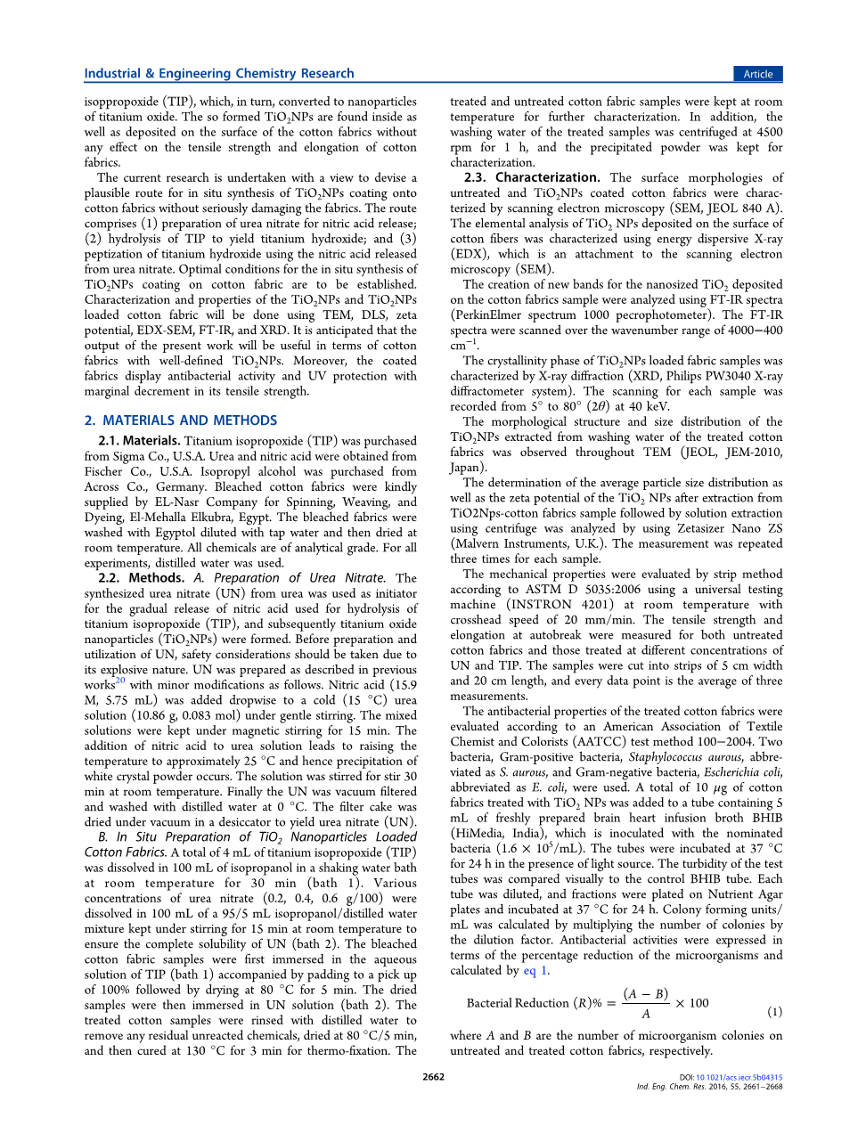通过(1)异丙醇钛(TIP)的水解,使用异丙醇进行原位沉积合成的TiO2NPs到棉织物上,得到原位TiO2NP涂布的棉织物,其显示于等式4和(2)胶溶使用通过氢氧化钛和UN(eq5)的反应形成的硝酸逐渐释放。Ti O Ti之间的氧化键由于释放的HNO 3的胶溶效应而容易地破裂,并且在结构重排之后促进形成具有不同形状(金红石/锐钛矿/两者的混合物)的TiO2NP。