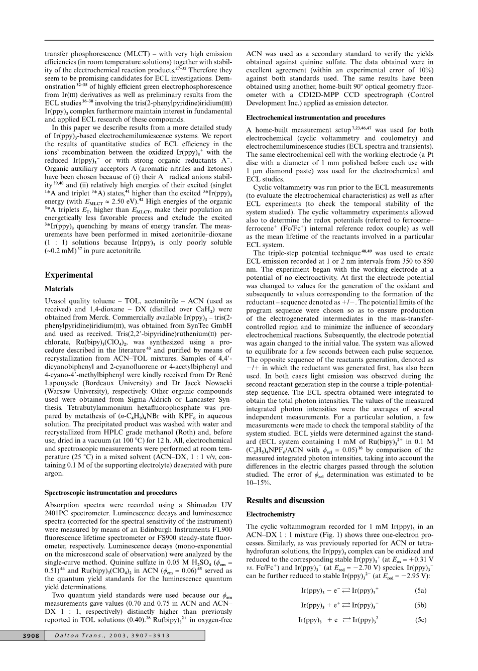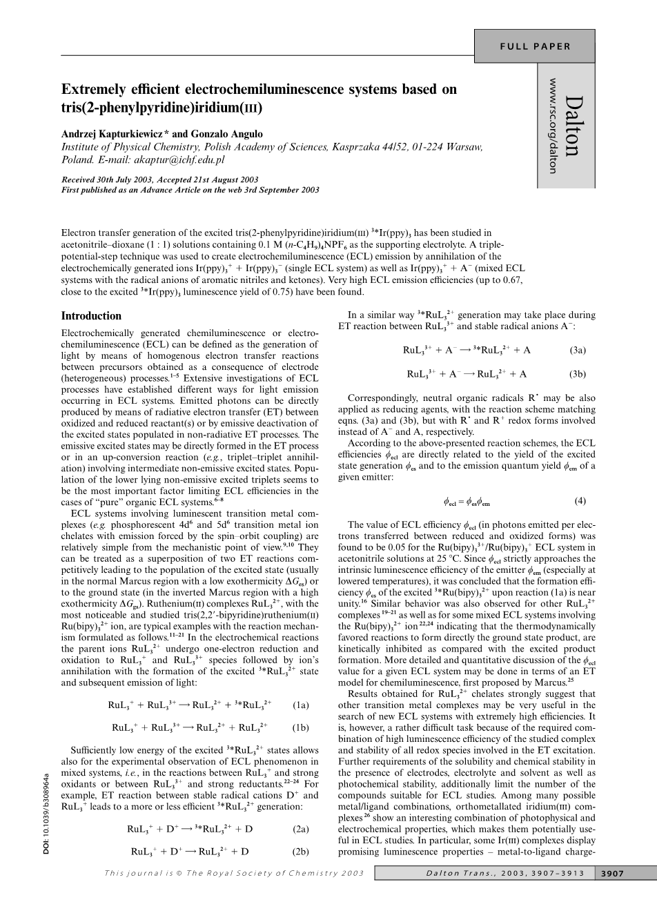 RuL321螯合物获得的结果表明,其他过渡金属配合物可能有助于寻找具有极高效率的新ECL系统。然而,这是一个相当困难的任务,因为所研究的复合物的高发光效率和涉及ET激发的所有氧化还原物质的稳定性必须有效配对起来。在存在电极、电解质和溶剂以及光化学稳定性的情况下的溶解度和化学稳定性的进一步要求限制了适用于ECL研究的化合物的数量。26 在许多可能的金属/配体组合中,邻近金属化的铱复合物显示光物理和电化学性质的有趣组合,这使得它们在ECL研究中潜在地有用。特别地,一些铱配合物络合物显示出了有效的发光性质 - 金属对配位体的电荷转移磷光(MLCT),其具有非常高的发射效率(室温溶液)以及电化学反应产物的稳定性。27-32因此,他们似乎是ECL调查中的备选选项。32-38