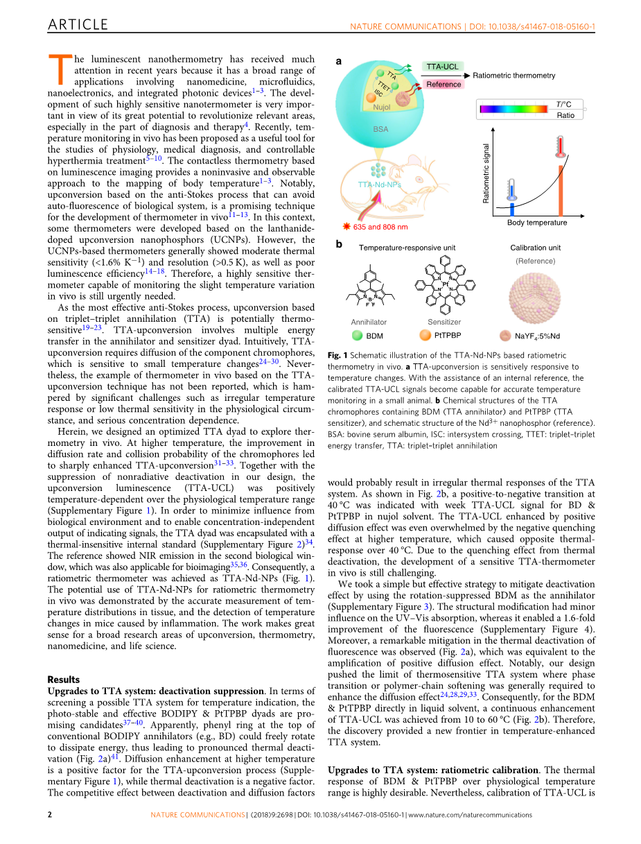 坦白地说,这种出色的TTA-Nd-NPs温度计的缺点是绿色UCL信号的穿透深度适中(补充图20)。 因此,在近红外领域中工作的热敏TTA-UC系统对于深层组织的未来应用而言可能是一个有吸引力的研究突破方向。切断NIR发射敏化剂作为参考还可以简化系统的配置。