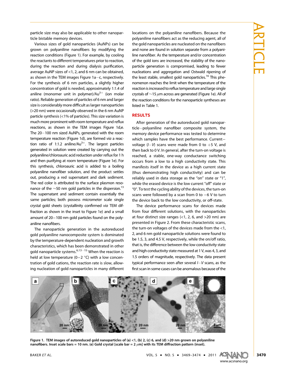 图2显示了由四种不同溶液制成的设备的性能扫描,其中纳米粒子在四个不同的尺寸范围(大于1、2、6和小于20纳米)下。从这些特征扫描中,发现由小于1、2和6纳米金纳米粒子溶液制成的器件的通电电压分别为1.5、3和4.5 V,而通断比(即在1 V下测量的低导电状态和高导电状态之间的差异)分别为4、3和1.5个数量级,分别为1、3和1.5个数量级。相当地。由于在制造过程中装置内积累的残余电荷,在某些情况下,第一次扫描可能会出现异常,数据呈现出典型的IV扫描后的性能。初始扫描可能会在性能曲线上出现跳跃;但是,经过几个周期后,性能曲线变得稳定且可重复。在第一次扫描期间,大于20纳米金纳米粒子器件确实打开一次,然后保持高导电状态,开启电压为6 V。在第一次扫描之后,该器件无法擦除并保持高导电状态。这表明该装置因长丝形成和/或相对较大(大于20纳米)金粒子的团聚而出现短路。对所有这些实验的分析得出的主要趋势是,随着粒子变大,进入高导通状态所需的通电电压增加,通断电流比降低。对于一个理想的设备,较大的开/关比提供更高的稳定性,较低的开启电压需要更少的功耗。较大的金纳米粒子显然不适合双稳态存储设备,因为它们的循环不良和高开启电压。然而,金粒子越大,粒子上的电荷存储容量就越大17。这会导致设备中的剩余电荷越大,从而增加关闭状态电流,从而导致更小的开/关比率。较小纳米粒子的低开启电压的趋势可能是由于金纳米粒子附近的屏障降低。因此,纳米粒子越小,器件的性能越好,器件通电所需的电压越低,开/关比越大。在这里测试的器件中,由于低开启电压、大开/关比和最佳显示循环,2纳米粒子复合材料的最佳性能被发现,写入读取擦除循环的数量在数百个。