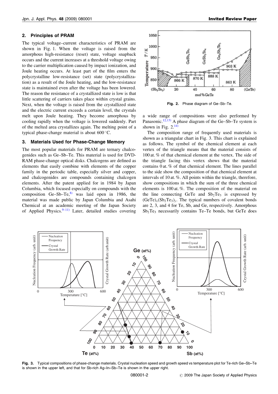 最受欢迎的相变随机存取存储器材料是三元硫族化合物,如Ge-Sb-Te。该材料用于DVD-RAM相变光盘。硫族元素是指容易与元素周期表中铜族元素结合的元素,特别是银和铜,硫族化合物是含有硫族元素的化合物。在日本哥伦比亚公司于1984年申请专利后,该公司于1986年开始专门研究具有Ge-Sb-Te的化合物,这种材料由日本哥伦比亚公司和朝日化学公司在日本应用物理学会的一次学术会议上公开。后来,松下也进行了涵盖各种成分的详细研究。Ge-Sb-Te系统的相图如图2所示。常用材料的组成范围如图3中的三角图所示。这个图表解释如下。三角形每个顶点处化学元素的符号表示该材料由顶点处100 at.%的化学元素组成。面向这个顶点的三角形的边表明,该材料中含有0 at.%的化学元素。平行于这条边的线表示这一化学元素的组成间隔为10 at.%。因此,三角形内的所有点都表示其中三种化学元素之和为100 at.%的组合物。连接GeTe和Sb2Te3线上的材料的组成由(GeTe)x(Sb2Te3)y表示。对于Te、Sb和Ge,共价键的典型数目分别是2、3和4。非晶Sb2Te3必然包含Te-Te键,但GeTe不包含。因此,当配方中的x变得大于y时,该结构更加刚性,就像在热稳定性更好的Ge5Sb2Te8组合物中。因此,当配方中的x变得大于y时,该结构更加刚性,如在热稳定性更好的Ge5Sb2Te8组合物中。对于这种组合物,结晶的能垒变得更高。
