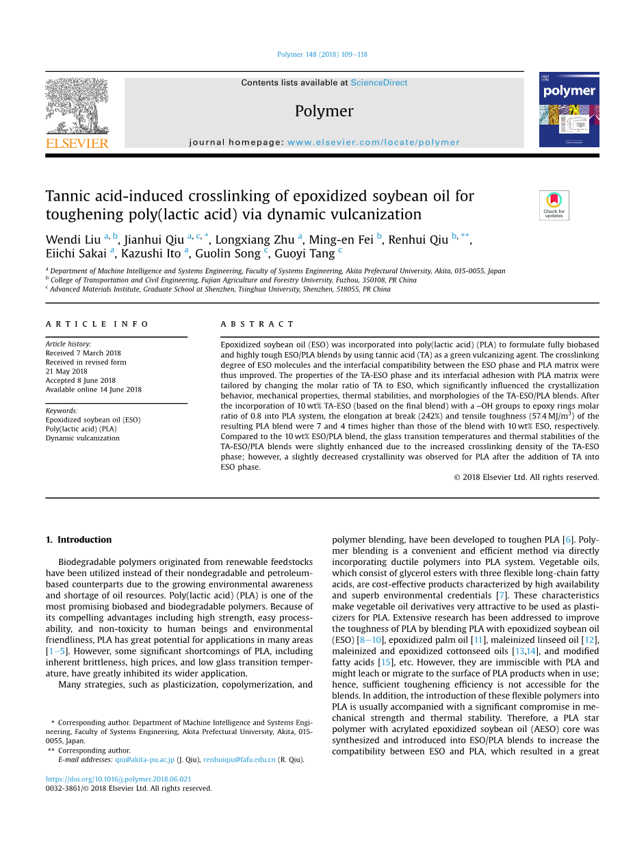 摘要 将环氧化大豆油(ESO)加入到聚乳酸(PLA)中,以单宁酸(TA)作为绿色硫化剂,形成完全生物基和高韧性的ESO/PLA共混物。从而提高了ESO分子的交联程度以及ESO相与PLA基体之间的界面相容性。通过改变TA与ESO的摩尔比,确定了TA-ESO相的性质及其与PLA基体的界面粘附性,显著影响了TA-ESO/PLA共混物的结晶性能、力学性能、热稳定性和形态。在PLA系统中加入10 wt%TA-ESO(基于最终共混物)和-OH基团与环氧环的摩尔比为0.8后,所得PLA共混物的断裂伸长率(242%)和拉伸韧性(57.4 MJ/m3)分别是10 wt%ESO共混物的7倍和4倍。与10 wt%ESO/PLA共混物相比,TA-ESO/PLA共混物的玻璃化转变温度和热稳定性略有提高,因为TA-ESO相的交联密度增加;然而,在ESO相中加入TA后,PLA的结晶度略有下降。