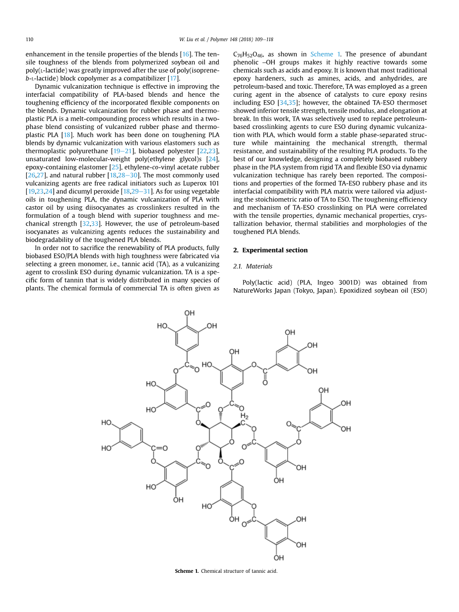为了不牺牲PLA产品的可再生性,通过选择绿色单体单宁酸(TA)作为硫化剂在动态硫化过程中交联ESO,制备了具有高韧性的完全生物基ESO/PLA共混物。TA是单宁的一种特殊形式,广泛分布于多种植物中。商用TA的化学式通常为C76H52O46,如图1所示。大量酚羟基的存在使其对某些化学品(如酸和环氧树脂)具有高度反应性。众所周知,大多数传统的环氧硬化剂,如胺、酸和酸酐,都是石油基的有毒物质。因此,在没有催化剂的情况下,TA被用作绿色固化剂来固化环氧树脂,包括ESO;然而,得到的TA-ESO热固性树脂表现出较低的拉伸强度、拉伸模量和断裂伸长率。在这项工作中,TA被选择性地用于取代石油基交联剂,以在PLA动态硫化过程中固化ESO,这将形成稳定的相分离结构,同时保持最终PLA产品的机械强度、耐热性和可持续性。据我们所知,通过动态硫化技术从刚性TA和柔性ESO设计PLA系统中的完全生物基橡胶相的报道很少。通过调整TA与ESO的化学计量比,对形成的TA-ESO橡胶相的组成和性能及其与PLA基体的界面相容性进行了调整。TA-ESO交联对PLA的增韧效率和机理与增韧PLA共混物的拉伸性能、动态力学性能、结晶行为、热稳定性和形态有关。
