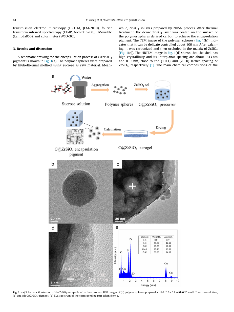 图1.(a)ZrSiO4包裹碳过程的示意图,(b)用0.25 mol L蔗糖溶液在180℃保温5 h制备的聚合物微球的TEM照片,(c)和(d) C@ZrSiO4色料,(e) 取自c相应部分的EDS能谱