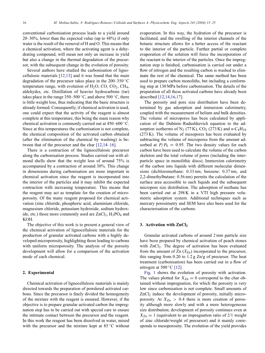 用X锌 增加孔隙率表明该反应物产生的孔隙率是由于相应洗涤后氯化锌留下的空间。事实上,当微孔和中孔的体积与用于浸渍的氯化锌的体积(使用2.9克/厘米的ZnCl2 固体的密度3 进行比较时)[12]), 两个价值观