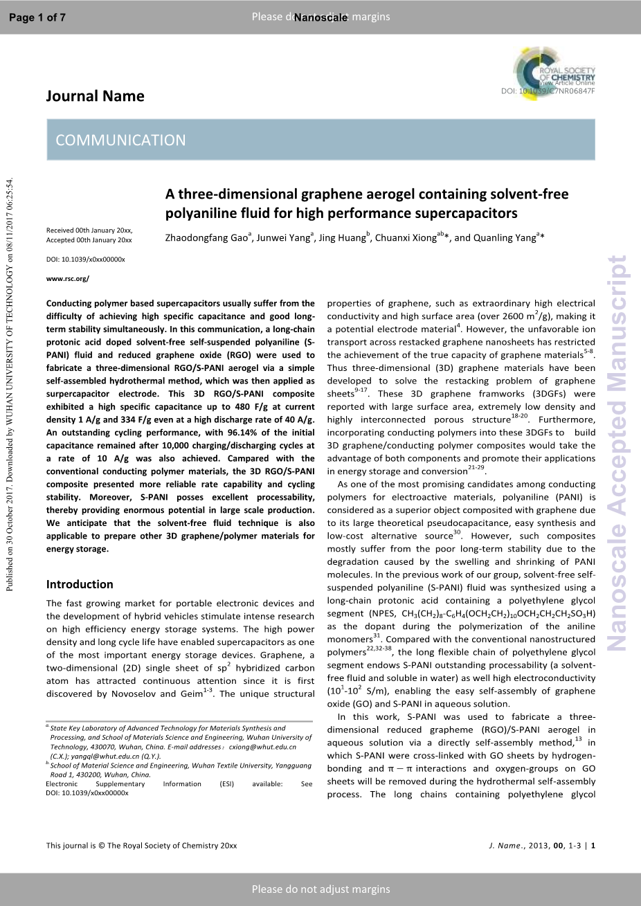三维石墨烯/自悬浮聚苯胺复合材料的制备及在超级电容器中的应用外文翻译资料